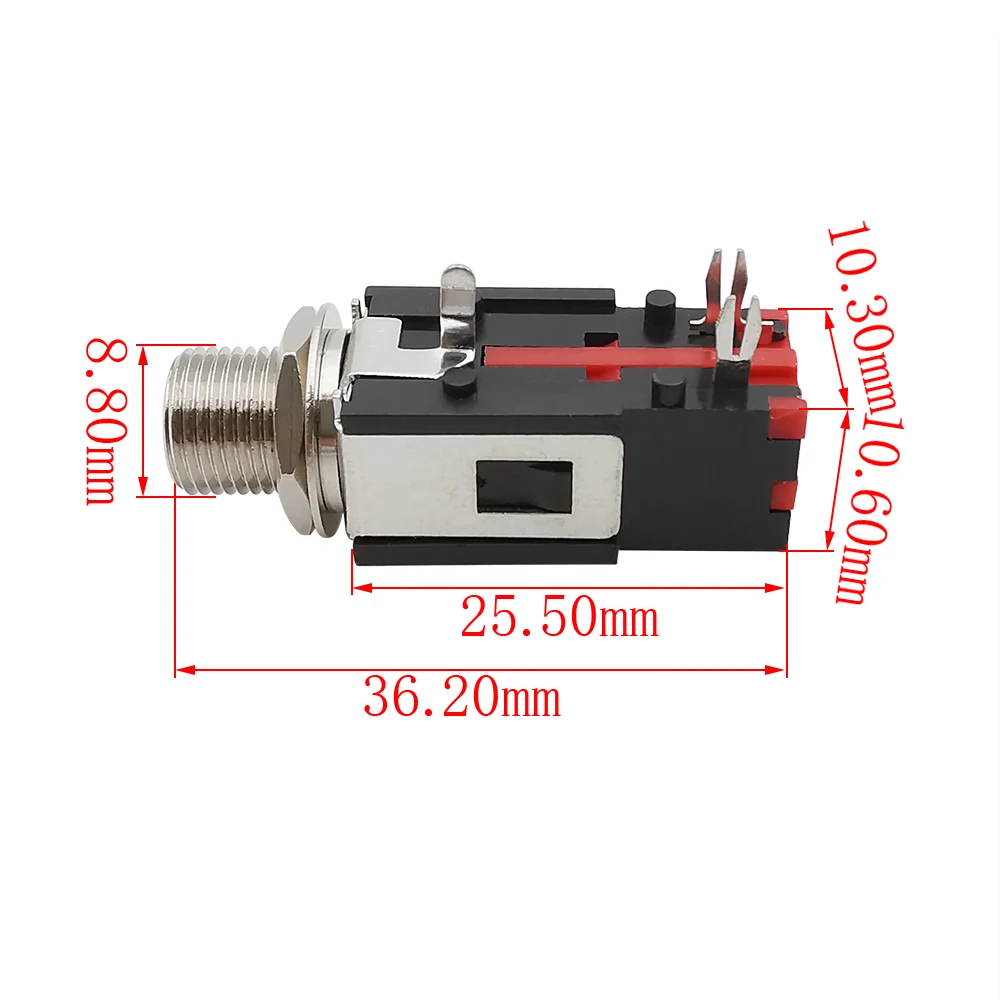 Материал: металл + пластикЦвет: черный, красный, серебристыйКонтакты: 3pinРазмеры: 6,35 мм/1/4 дюймаПол: женскийТип: PJ-602BПосылка: 1/3/5 шт х PJ-602B аудиоразъем с прямым угломПримечание:1. Пожалуйста, подтвердите, является ли это продуктом, который вам нужен, перед оплатой.2. Замеры сделаны вручную, поэтому возможны ± 0-2 мм разницы в связи с тем, что измерения выполнены вручную.(1 дюйм = 2,54 см)3. Недостатки продукта на картинке могут быть вызваны освещением, изображение может не отражать фактический цвет продукта, с учетом фактического продукта.Перед размещением заказа, пожалуйста, внимательно ознакомитесь со всеми условиями. Спасибо!