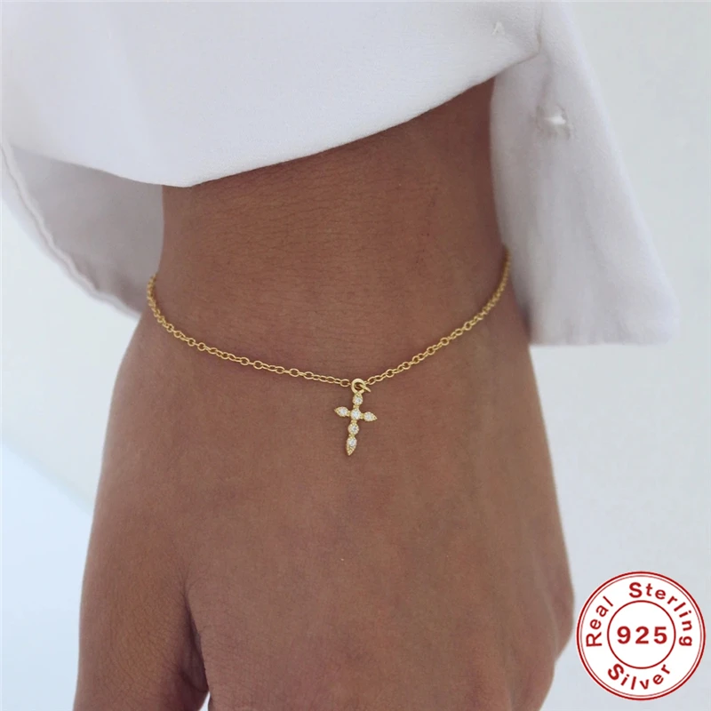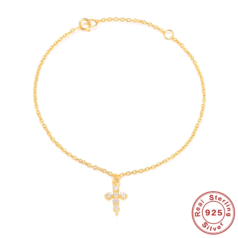 Женский золотистый браслет с подвеской-крестом из серебра 925 пробы