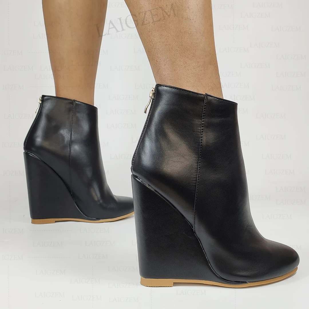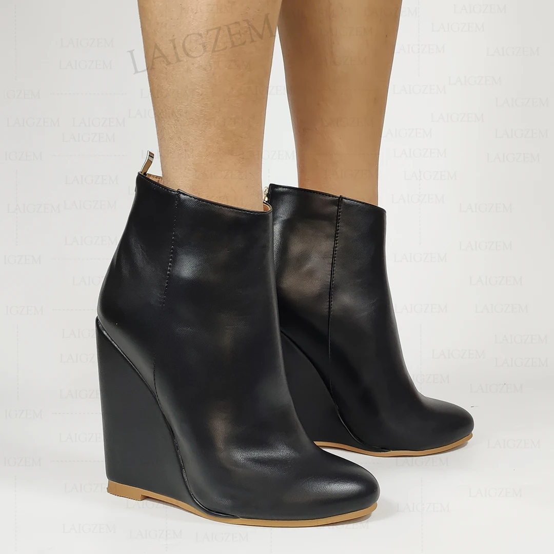 LAIGZEM/женские ботильоны с круглым носком, на танкетке, на высоком каблуке, с молнией сзади; Женская обувь из искусственной кожи; Женская обувь; Большие размеры 41, 44, 47, 50, 52