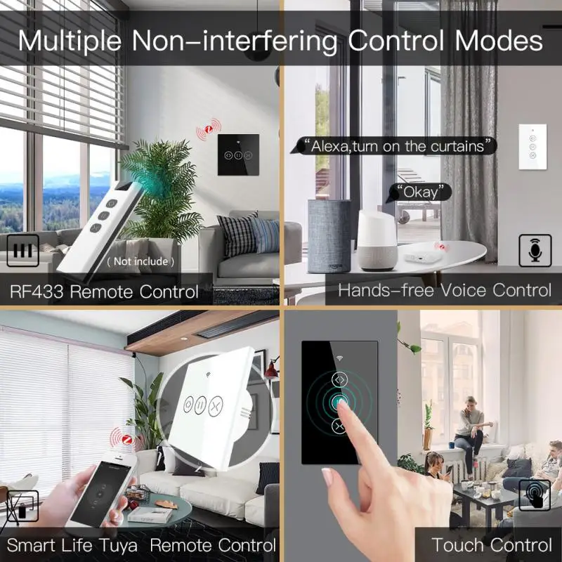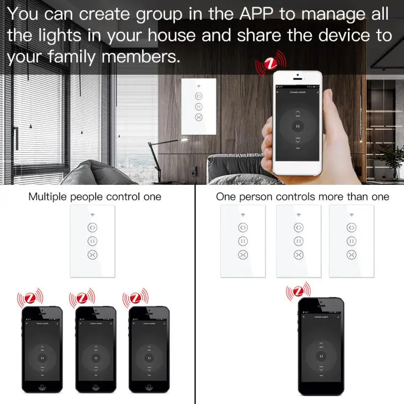 4. Подходит для различных видов штор, таких как оконные жалюзи/рольставни/жалюзи/рольставни. Установите умный переключатель штор во многих местах, таких как офис/кабинет/спальня/гостиная и т. д., даже Управляйте тентом во дворе.
