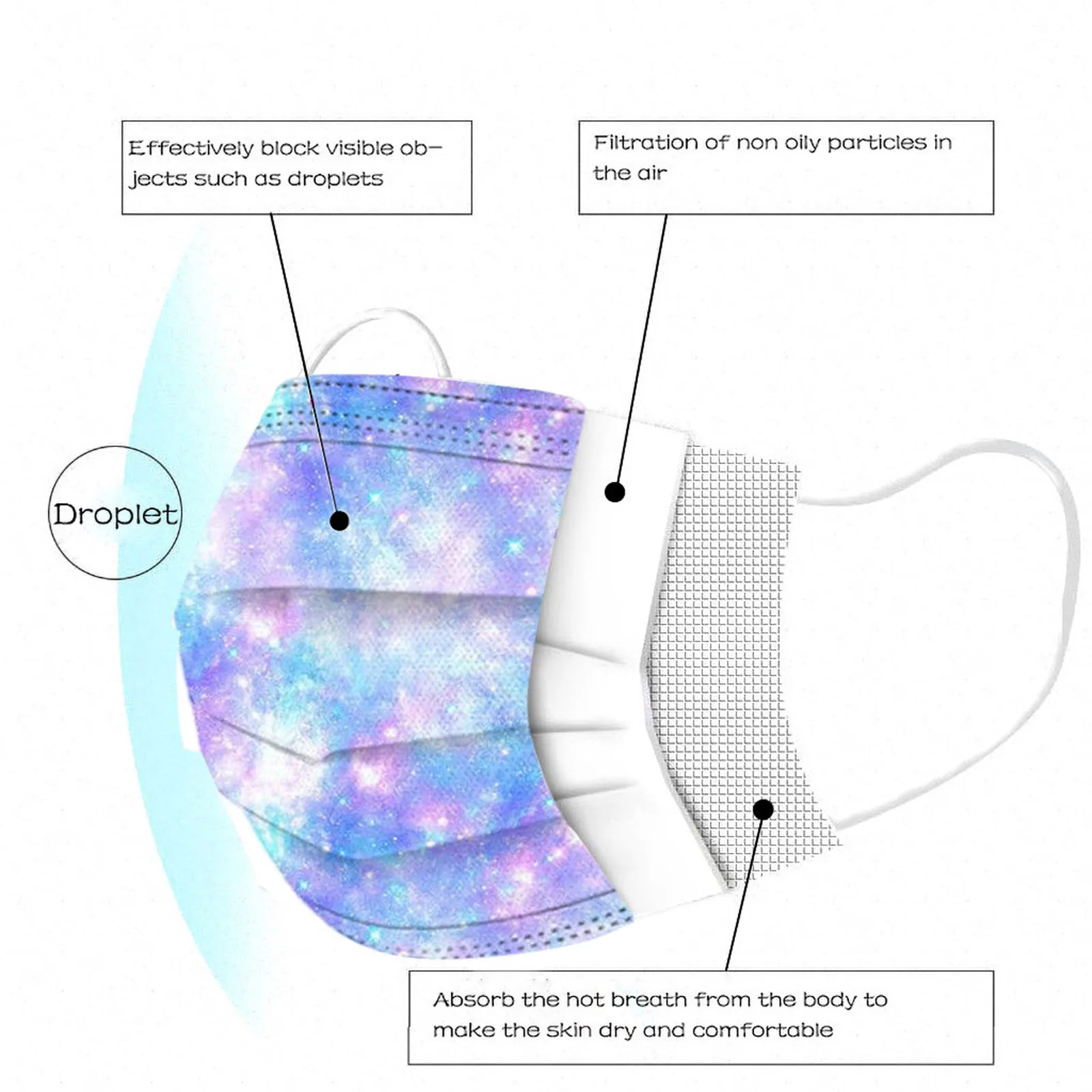 В 3 слоя Нетканая одноразовая маска изготовлена из 3 слоев нетканого материала, Безопасен и безопасен для использования. Дышащий материал и милый Узоры, которые делают его полезным и модным. Специальный 3 слоя из нетканого материала Дизайн, обеспечивает некоторую защиту от пыли, автомобильных выхлопных газов, Пыльца и т. д. эластичная Ушная петля, легко носить и не давит на уши. Маникюрный салон или любые другие области, где может потребоваться защита