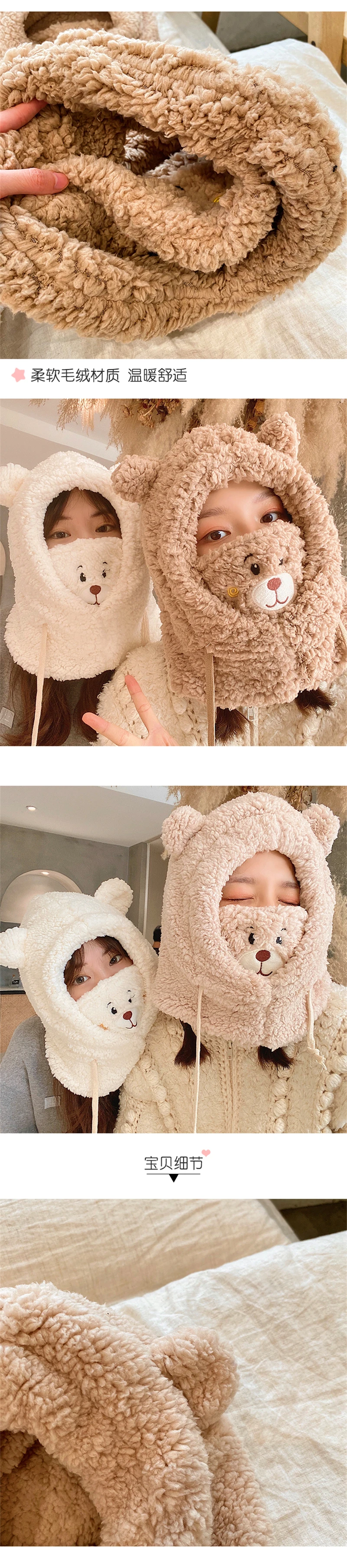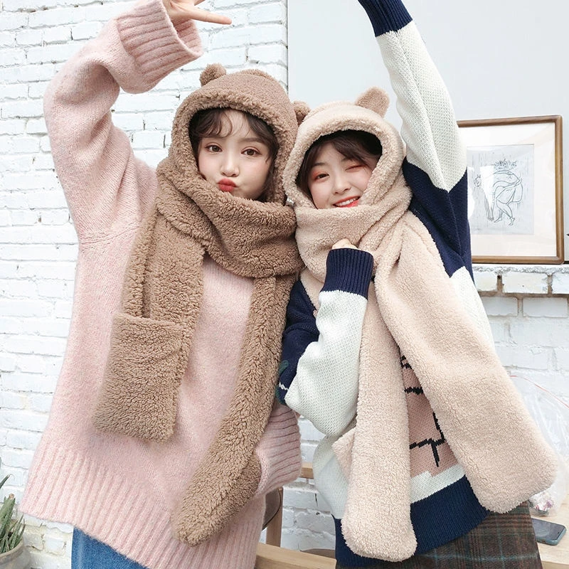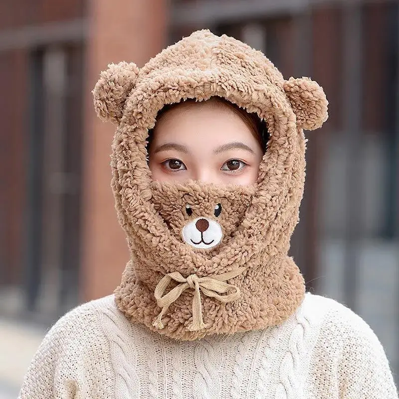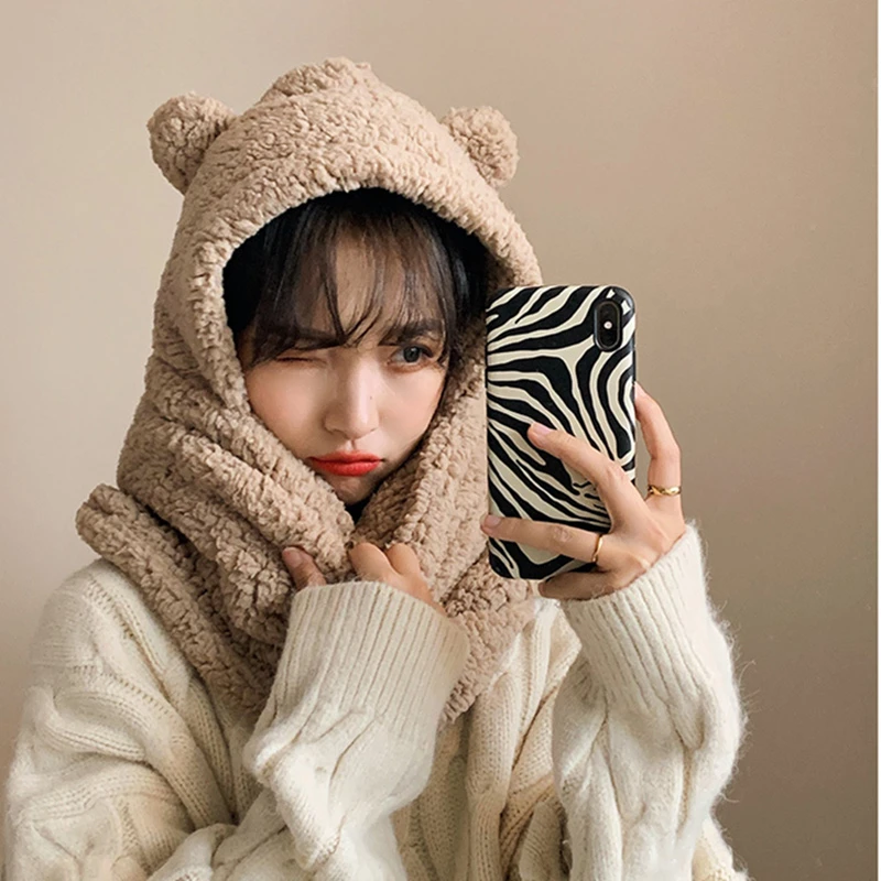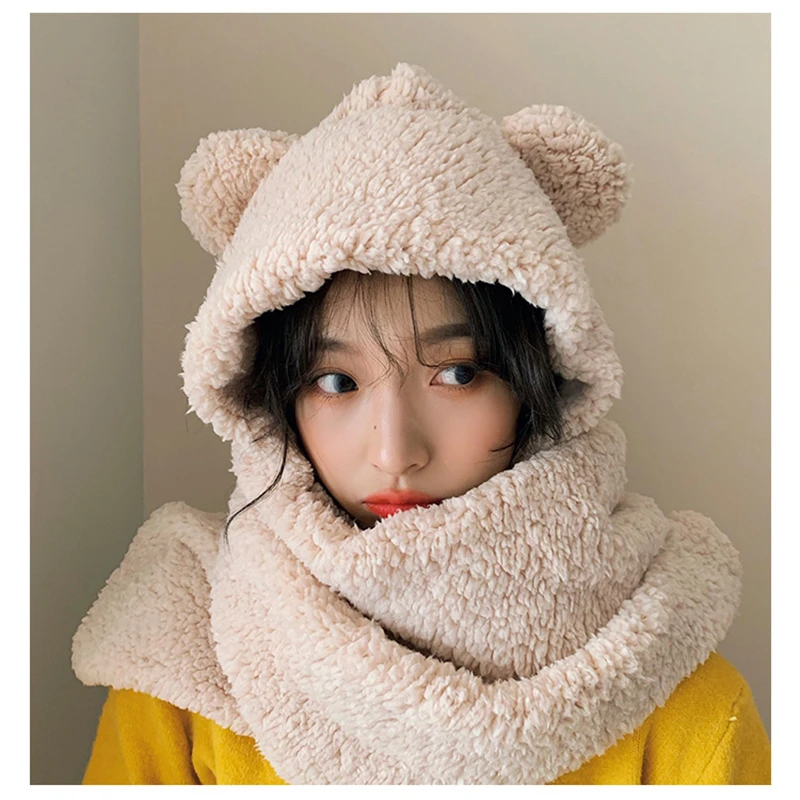 Однотонные зимние женские шапки-бини в форме медведя для девочек, шапки 2022, ветрозащитный плюшевый плотный шарф для студенток, Женский комплект шапки, накидка, головной убор