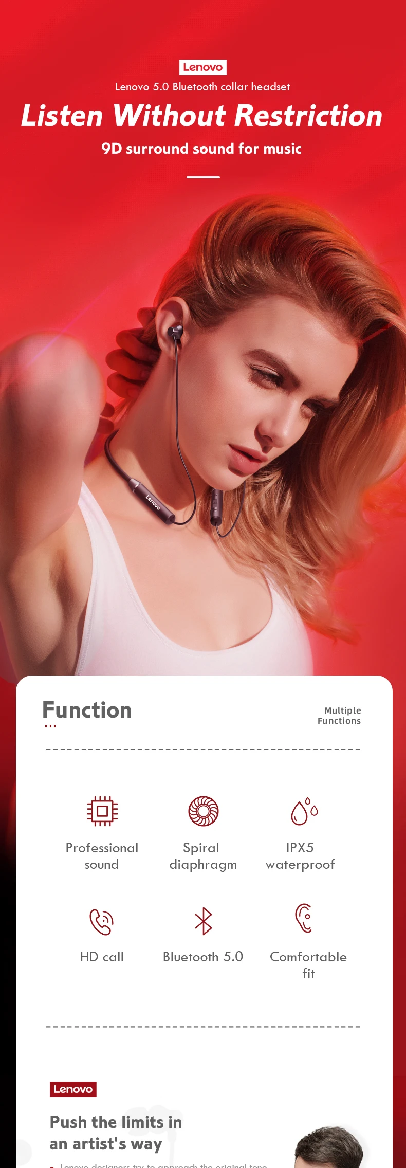 Оригинал, Lenovo HE05, Bluetooth 5,0, беспроводная гарнитура, магнитный шейный ремешок, спортивные наушники для бега, наушник, водонепроницаемый, шумоподавление