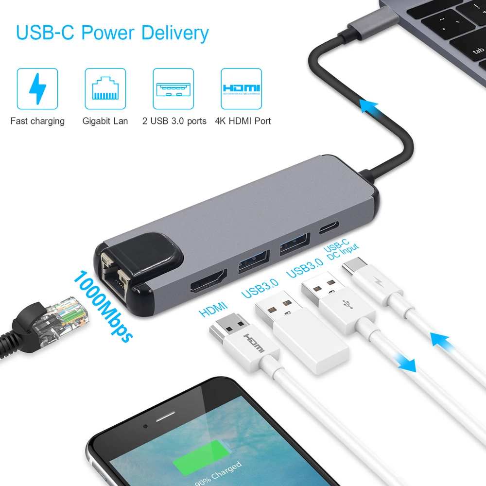 USB-концентратор с разъемом 1000 Мбитс, RJ45, 4K, HDMI
