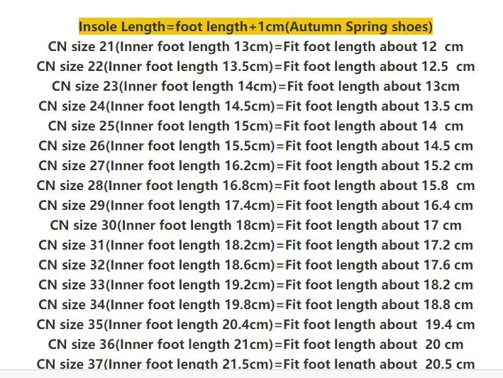 Длина стельки = длина стопы + 1 см (Демисезонная обувь) Размер CN 21 (Длина внутренней стопы 13 см) = длина стопы около 12 см Размеры CN; 22 (размеры соответствуют внутренней длине стопы 13,5 см) = соответствует европейскому размеру длины стопы около 12,5 см Размер CN 23 (Длина внутренней стопы 14 см) = длина стопы около 13 см Размеры CN; 24 (размеры соответствуют внутренней длине стопы 14,5 см) = соответствует европейскому размеру длины стопы около 13,5 см Размер CN 25 (Длина внутренней стопы 15 см) = длина стопы около 14 см Китайский Размер 26 (размеры соответствуют внутренней длине стопы 15,5 см) = соответствует европейскому размеру длина стопы около 14,5 см Размер CN 27 (Длина внутренней стопы 16,2 см) = длина стопы около 15,2 см Размер CN 28 (Длина внутренней стопы 16,8 см) = длина стопы около 15,8 см Размер CN 29 (Длина внутренней стопы 17,4 см) = длина стопы около 16,4 см Размер CN 30 (Длина внутренней стопы 18 см) = длина стопы около 17 см Размер CN 31 (Длина внутренней стопы 18,2 см) = длина стопы около 17,2 см Размер CN 32 (Длина внутренней стопы 18,6 см) = длина стопы около 17,6 см Размер CN 33 (Длина внутренней стопы 19,2 см) = длина стопы около 18,2 см Размер 34 CN (Длина внутренней стопы 19,8 см) = длина стопы около 18,8 см Размер CN 35 (Длина внутренней стопы 20,4 см) = длина стопы около 19,4 см Размер 36 CN (Длина внутренней стопы 21 см) = длина стопы около 20 см CN размер 37 (размеры соответствуют внутренней длине стопы 21,5 см) = соответствует европейскому размеру длины стопы около 20,5 см