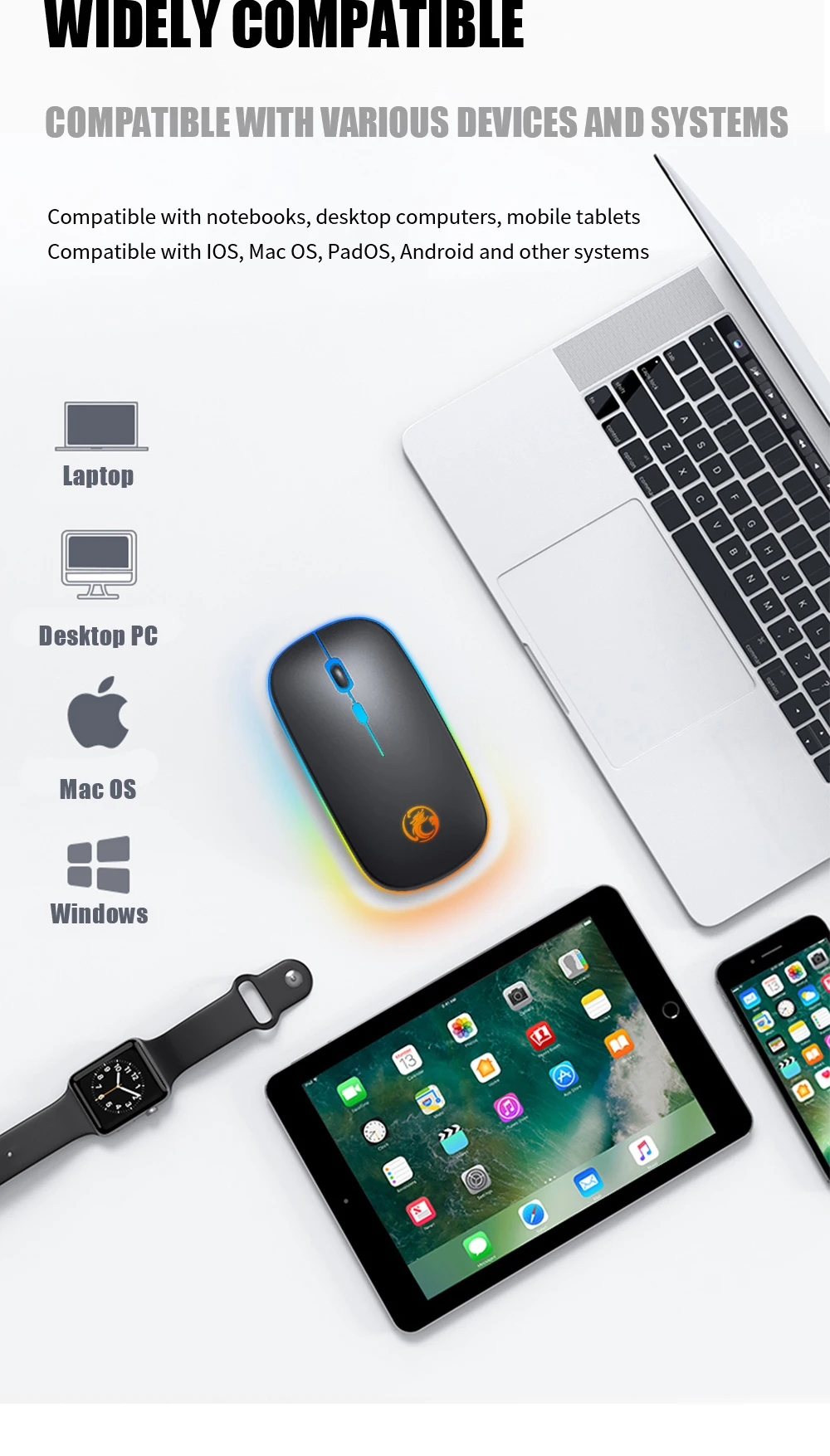 1. Требования к системе режима Bluetooth:(1) iPadOS 13 или более поздней версии(2) iOS 13 или более поздняя версия(3) Windows 8/ 10 или более поздняя версия(4)Mac OS X 10,10 или более поздняя версия(5) Android 5,0 или более поздняя версия.2. Есть два режима: Bluetooth + беспроводной двойной режим и беспроводной режим, пожалуйста, выберите правильный вариант3. Когда курсор мыши не может определить точное местоположение, мышь должна быть заряжена.4. При зарядке колесо прокрутки-синий светильник.