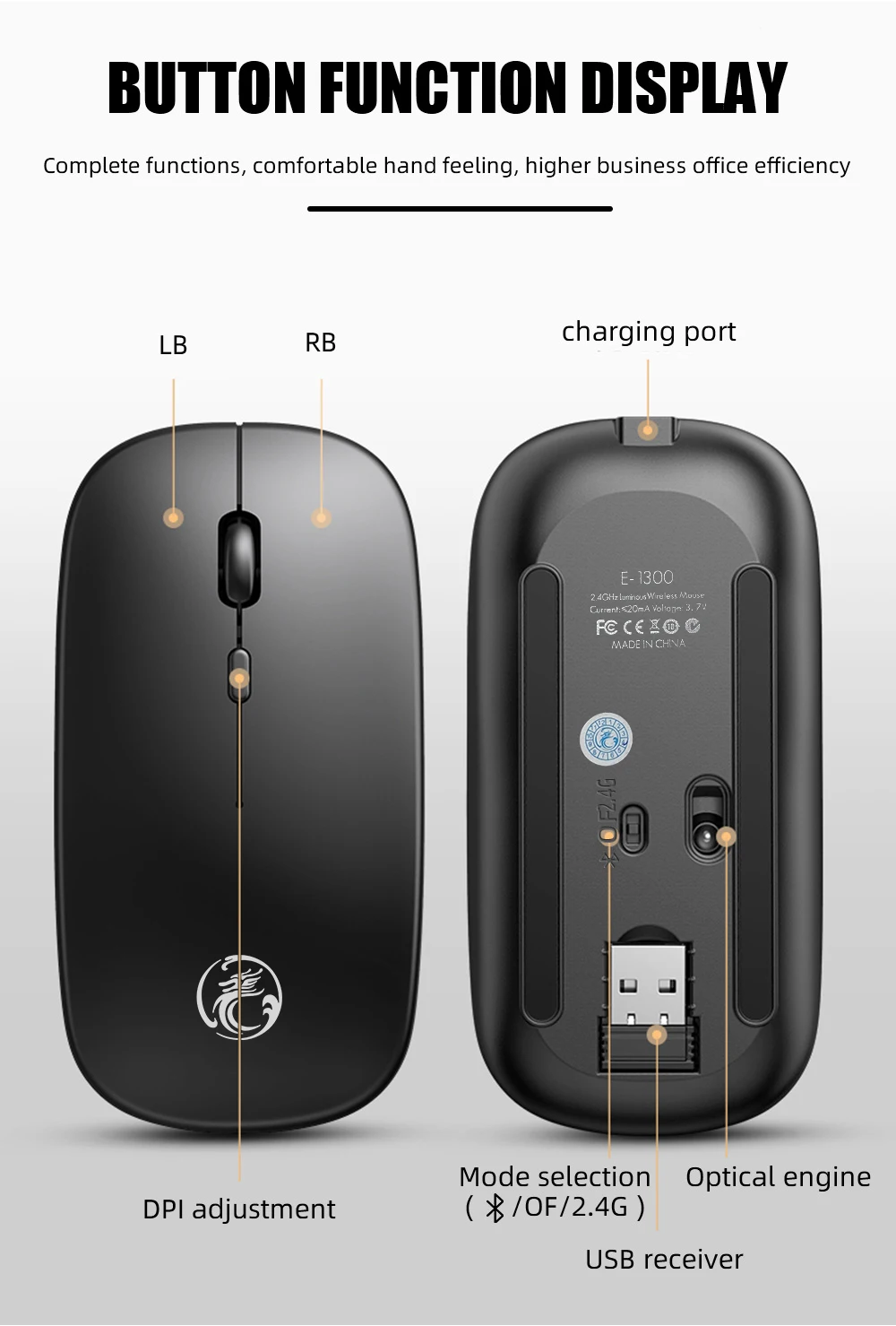 1. Новый модернизированный: уникальная технология зарядки, встроенный литиевый аккумулятор2. Бесшумный дизайн: левый и правый щелчок-это оба тишины, без звука, когда вы нажимаете3,3 видов DPI: Регулировка обеспечивает точное позиционирование