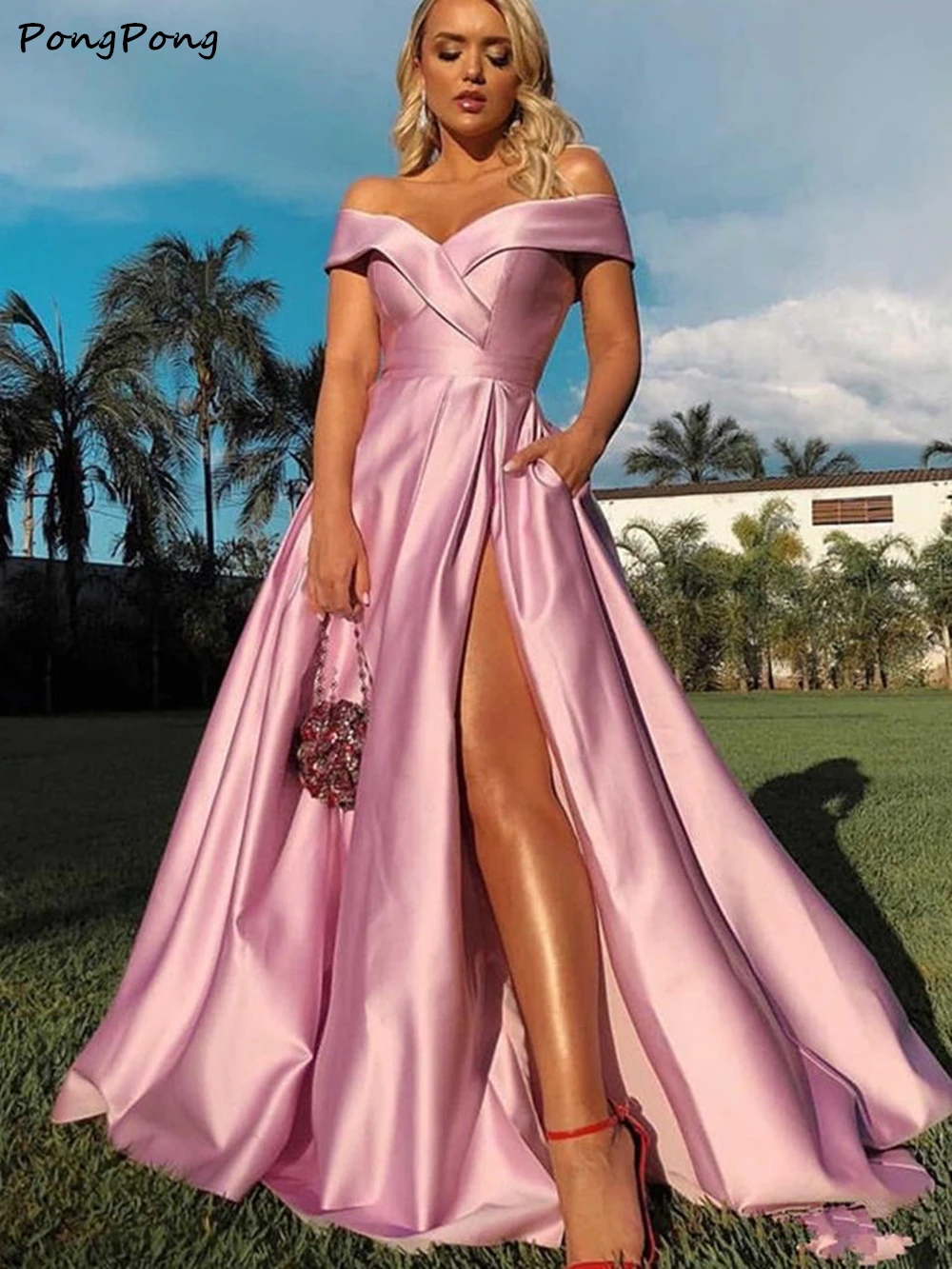 Розовое Атласное длинное платье для выпускного вечера с V-образным вырезом, 2021, с открытыми плечами, с разрезом спереди и карманом, в пол, женское платье для вечеринки