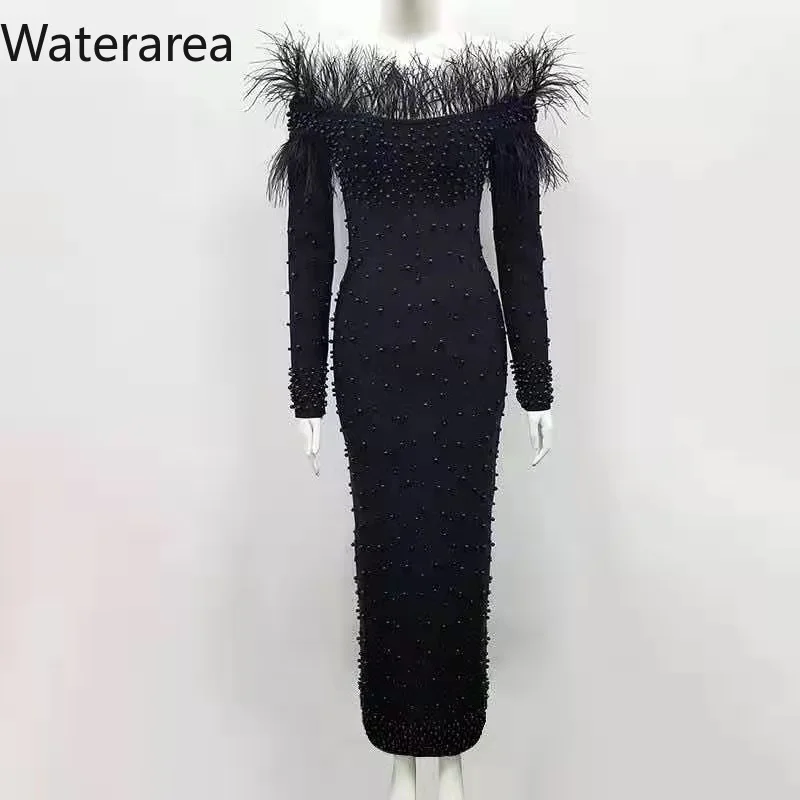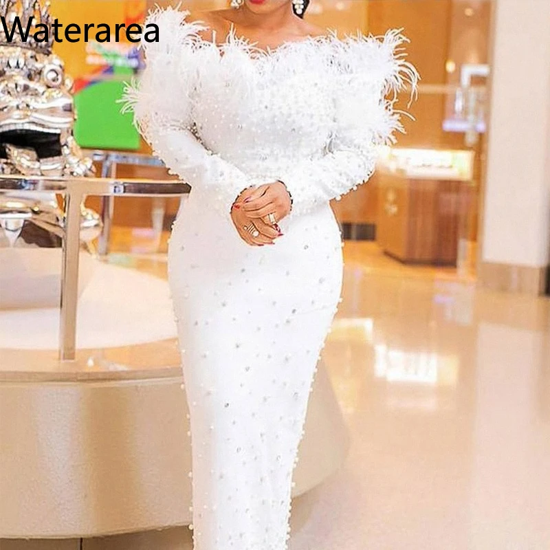 Сексуальное женское платье Waterarea с воротником-лодочкой, модное облегающее платье с перьями и бусинами, Клубная одежда, элегантное однотонное вечернее платье