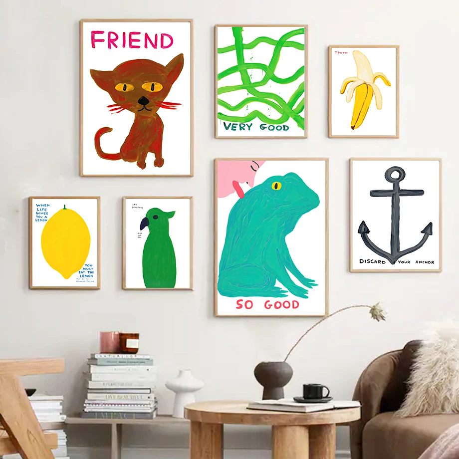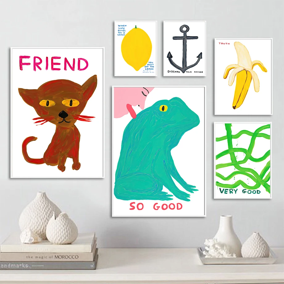 David Shrigley, попугай, лягушка банан и лимон, настенная живопись на холсте, скандинавские постеры и принты, настенные картины для декора гостиной