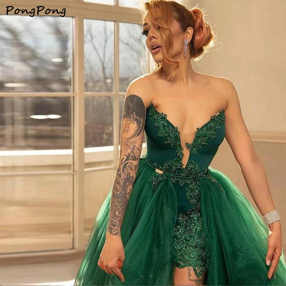 Зеленые кружевные вечерние платья 2022 со съемным шлейфом, аппликации без бретелек, блестящие платья для выпускного вечера, вечерние платья с V-образным вырезом
