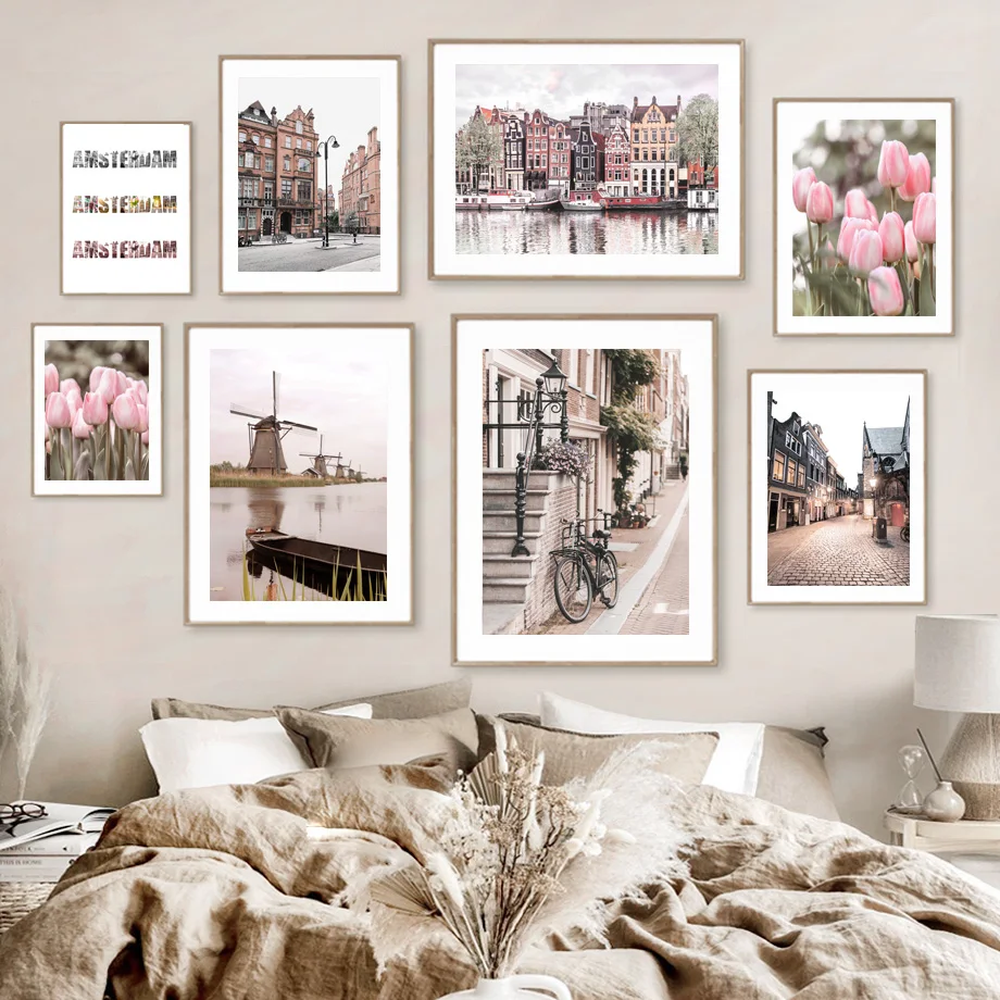 Розовый тюльпан, морской пляж, река, вид на город, скандинавские ст...