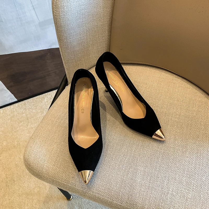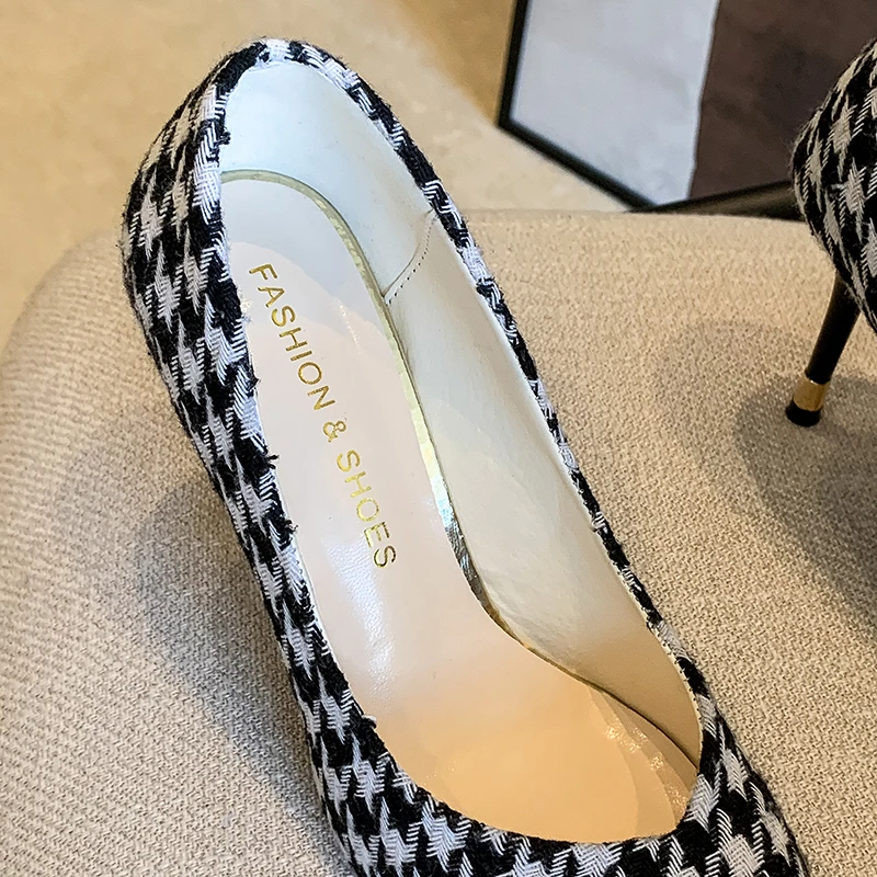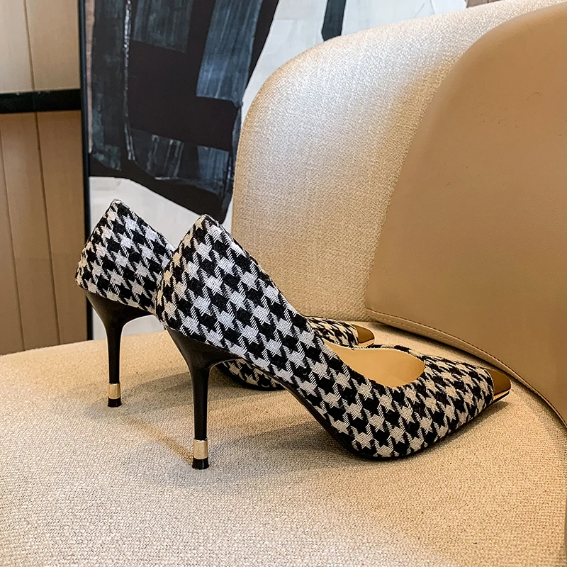 Пикантные женские туфли на высоком каблуке; Женские туфли на шпильке с узором гусиные лапки; Свадебные туфли с металлическим острым носком; AD1152