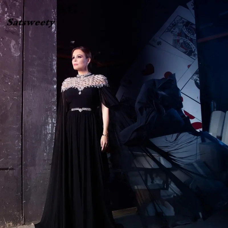 Yousef Aljasmi черное шифоновое длинное арабское вечернее платье с рукавами-накидками Кристаллы Стразы платье с высоким воротником для матери невесты