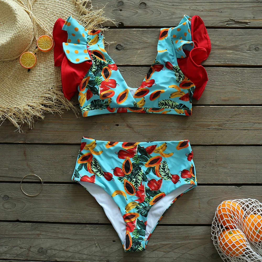 Новинка 2022, женский купальник с принтом в виде привлекательных глаз, комплект бикини с оборками, купальные костюмы с высокой талией для купального костюма