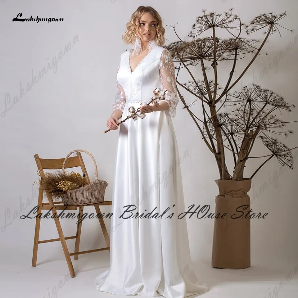 Женское атласное платье с V-образным вырезом, с кружевными рукавами