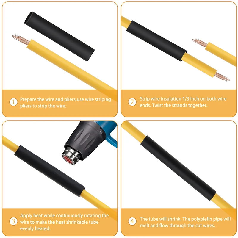 2. Простота в использовании: термоусадочная трубка должна нагреваться только с помощью горячего воздушного пистолета для завершения склеивания, что быстрее и проще, чем традиционные методы.