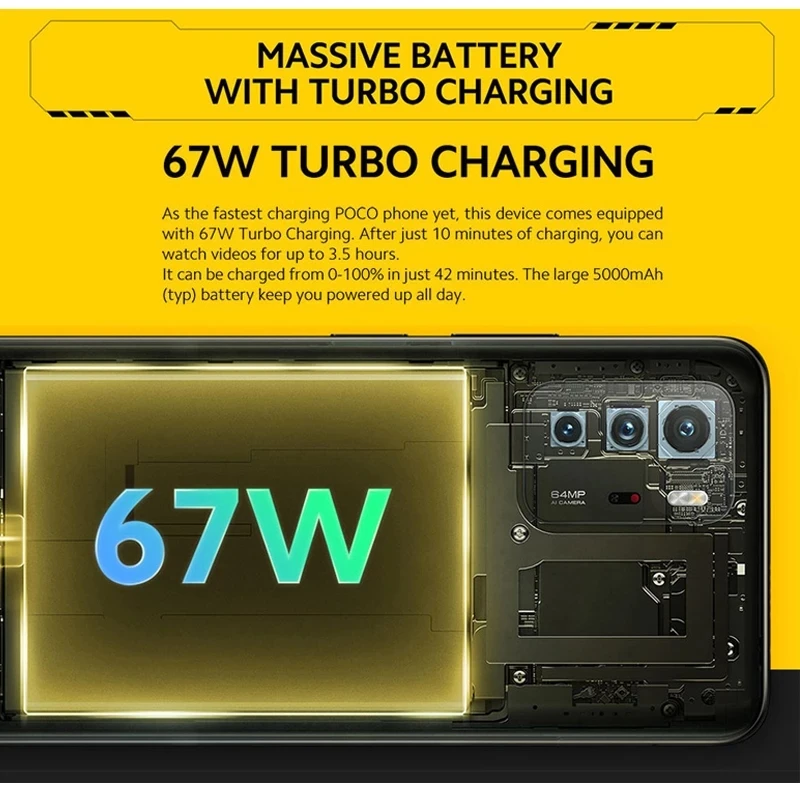 В качестве самого быстрого зарядного устройства POCO phone, это устройство оснащено турбо-зарядкой 67 Вт. Буквально через 10 минут зарядки, вы canwatch видео до 3,5 часов.