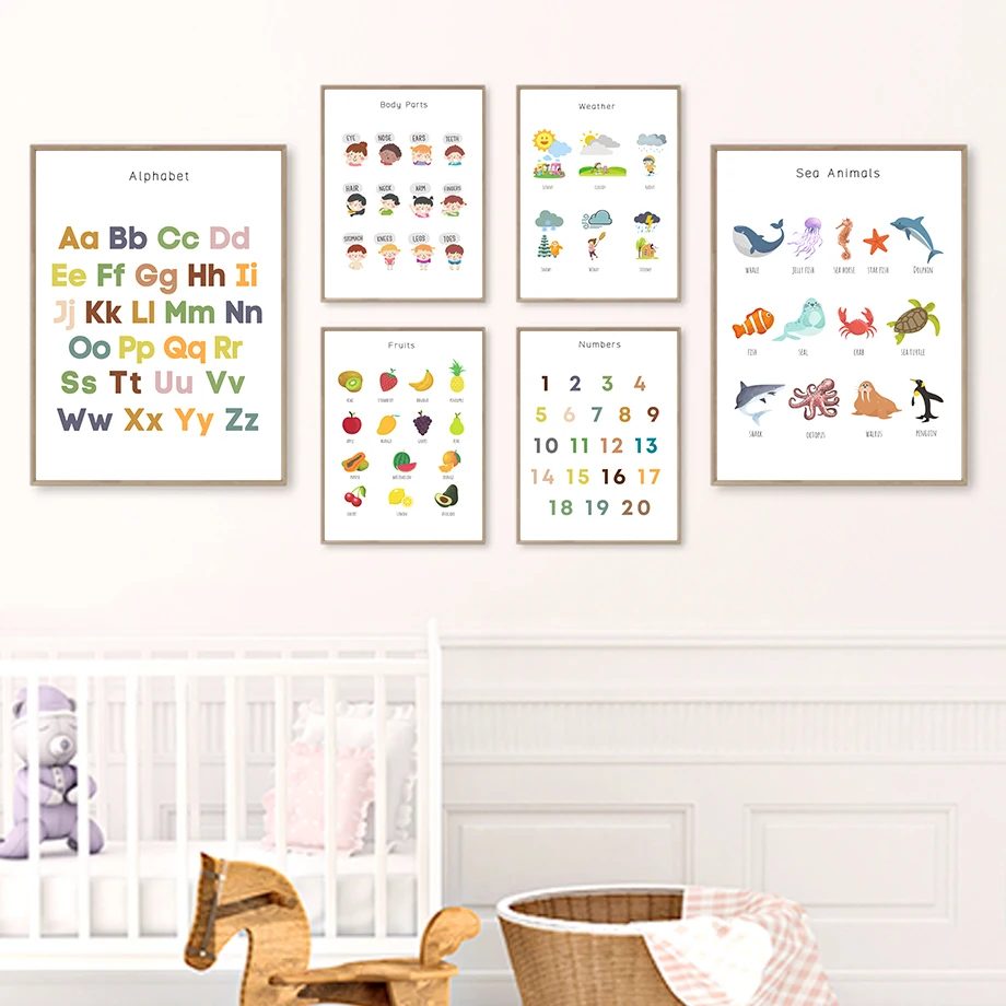 Настенная картина с цифрами и АБС-алфавитом, в форме цветных фруктов, настенная Картина на холсте, образовательные плакаты и аксессуары для декора детской комнаты