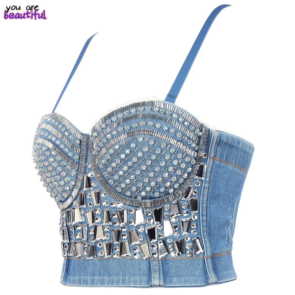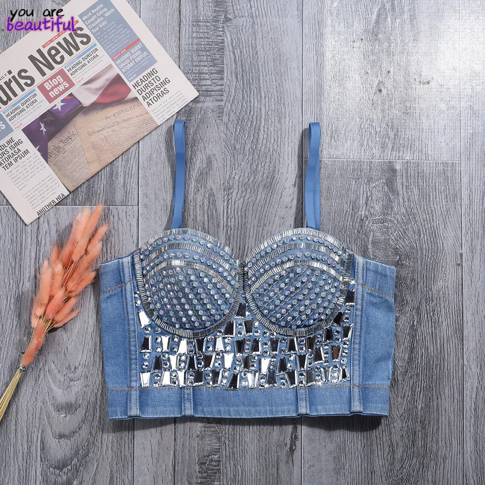 Стразы, акриловый Джинсовый корсет с блестками, короткий топ для танцев, ночного клуба, вечевечерние, модель 2022 года, летняя винтажная женская одежда