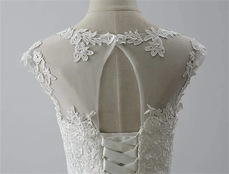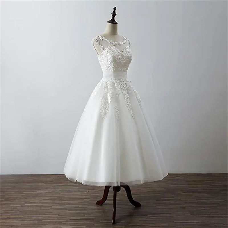 ТРАПЕЦИЕВИДНОЕ Короткое атласное Сетчатое кружевное свадебное платье длиной до середины икры с аппликацией и глубоким круглым вырезом платье невесты корсет на спине