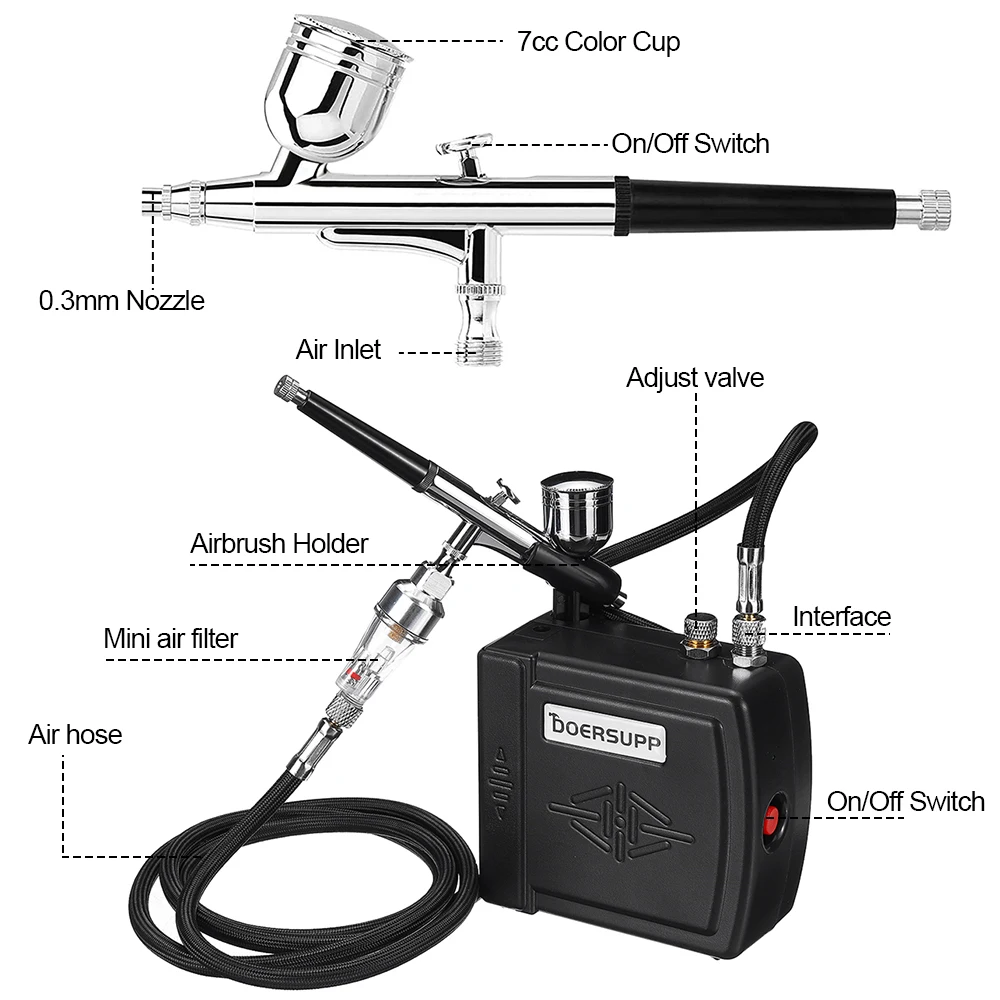 Особенности:-Включает в себя портативный воздушный компрессор, воздушный шланг, двойного действия гравитационный питательный Аэрограф, мини воздушный фильтр, держатель, гаечный ключ и капельница.-Pro двойного действия гравитационный питательный Аэрограф набор для хобби краски ремесла.-Аэрограф для изготовления моделей, украшения тортов, нарисуйте контур камуфляжа, татуировки гвоздь и т. д.-Довольно Прочный мини воздушный компрессор, портативный светильник, вес и легко носить с собой.-Экономьте гораздо больше времени, чем Рисование ручной работы, и отлично подходит для вашего бизнеса с распылителем.-Конструкция двойного действия экономит сырье и долговечность.-Широко используется энтузиастами общей модели.-Этот мини-компрессор использует специальную конструкцию без масла. Это не масло делает среднюю передачу не загрязненной. Выходная жидкость устойчива и диапазон давления от 0 до 21 psi.-Этот профессиональный комплект воздушного компрессора airbrush широко используется в производстве моделей, украшении тортов, татуировках, Нейл-Арте и т. д. Идеально подходит для художественных работ, красоты ногтей, боди-арта, дизайнерской живописи, модельной живописи, украшения тортов, ремесел, моделей и изобразительного искусства, таких как рисование автомобиля, текстиль и футболка.