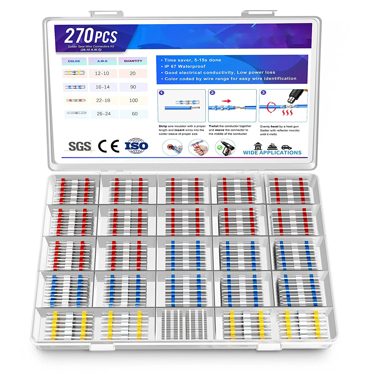 50 шт. Термоусадочные соединители для провода------ Предоставить вам квалифицированные терминалы и удовлетворить ваши потребности в различных проектов электропроводкиНезависимо от того, работаете ли вы на своей лодке, транспортном средстве, домашнем или Научном объекте, наши термоусадочные паяльные и уплотнительные соединители обеспечат плотную пайку, повышенный ток и всепогодные соединения каждый раз ~Особенности:● Коэффициент усадки 2:1● Легкие одношаговые Проводные соединения.● Простая Идентификация: цветная соединительная трубка.● Полиолефиновые термоусадочные стыковые разъемы улучшают прочность на изгиб.● Высококачественные провода разъемы в уплотнение, сброс напряжения, проверка кабеля и изоляция.● Плавленный припой обеспечивает прочное соединение проводов и позволяет избежать выскальзывания проводов из терминала.● Соблюдайте все соответствующие стандарты: ROHS, ISO 9001:2008, SGS и CE.Посылка включает в себя:● 1 × 250 шт термоусадочные Паяные соединители (четыре размера/цвета)