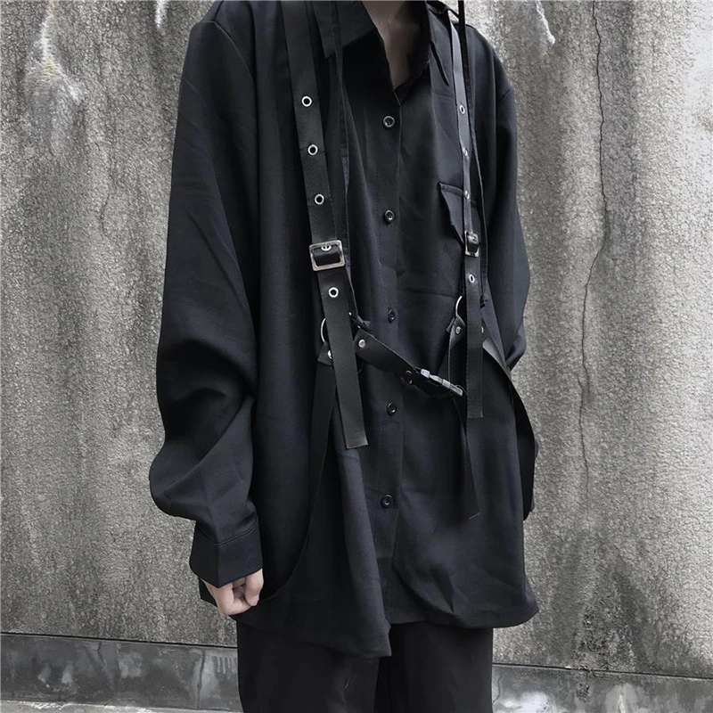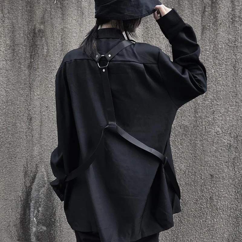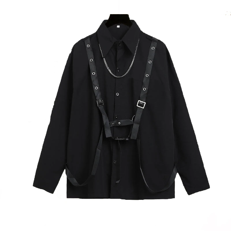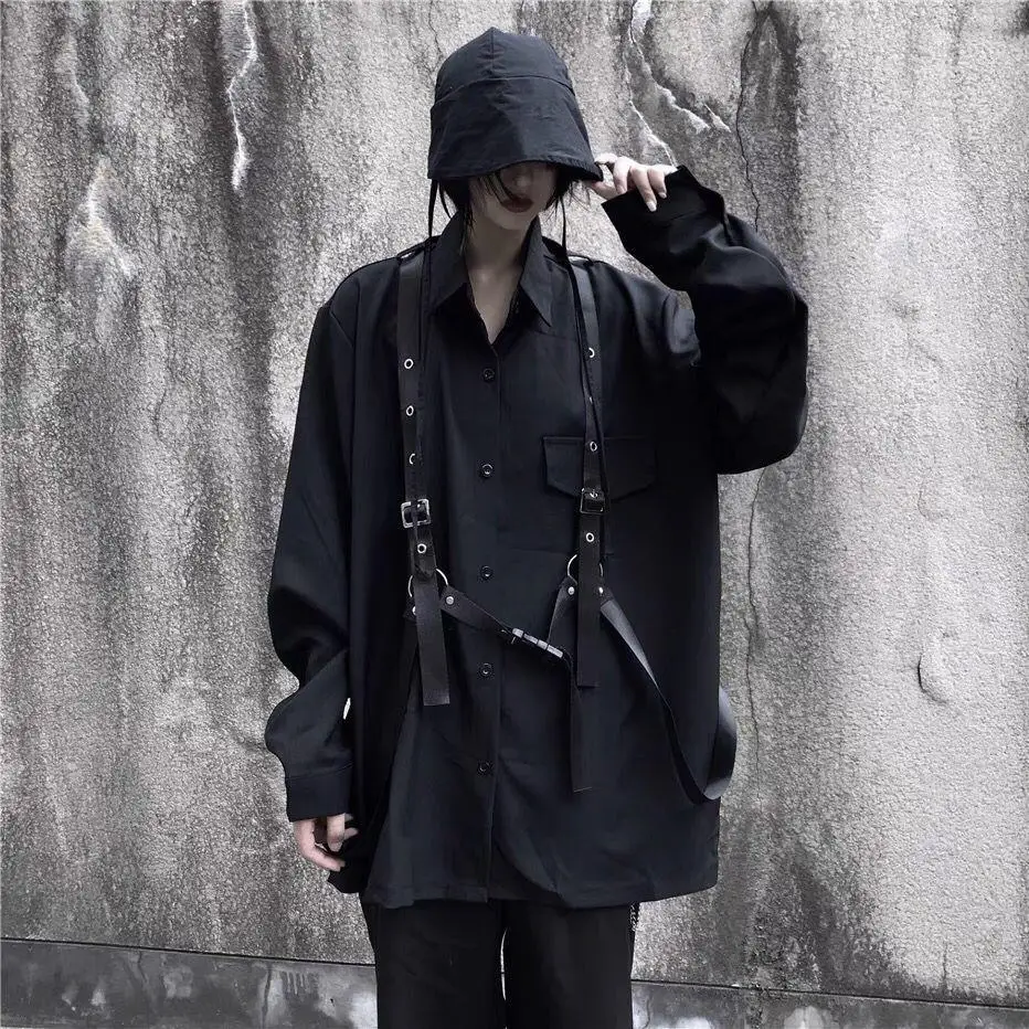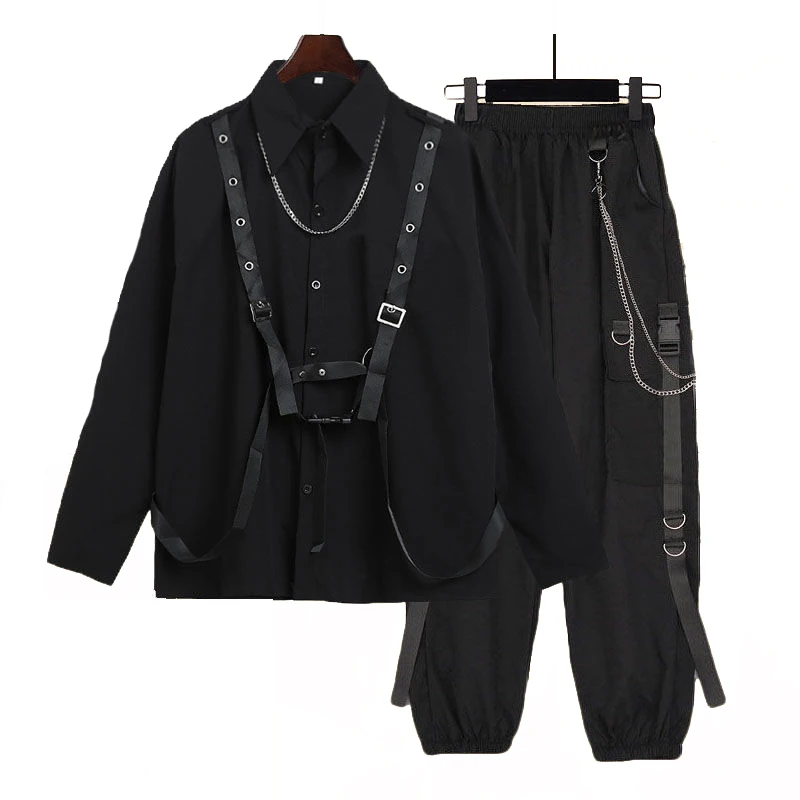 Весенне-осенняя бандажная рубашка с цепочкой, свободные брюки-карго, Женский Повседневный Однотонный черный комплект из 2 предметов в стиле хип-хоп с длинными рукавами