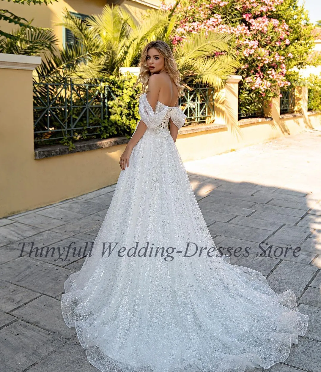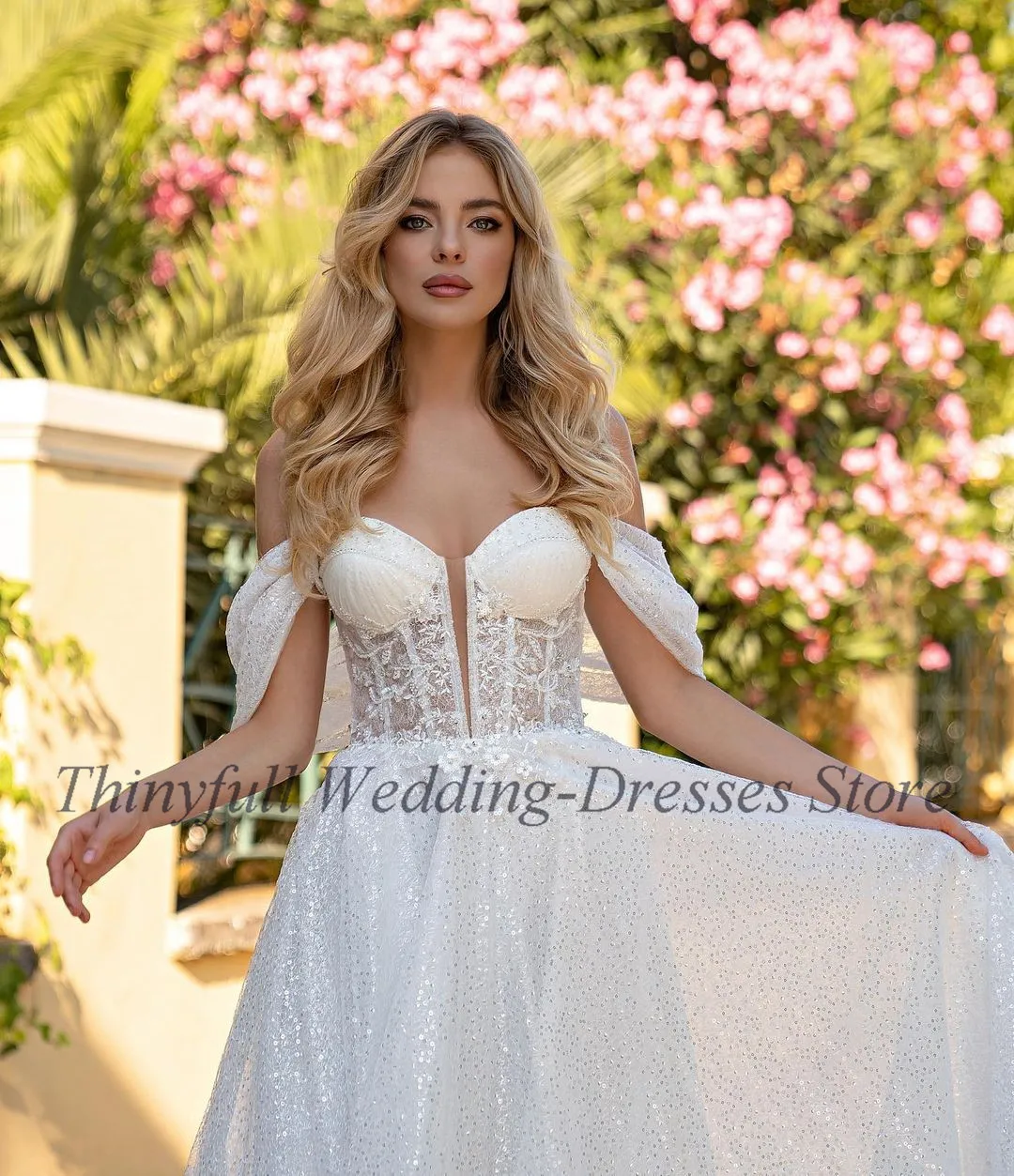 Винтажные блестящие кружевные свадебные платья Thinyfull из тюля в стиле бохо с открытыми плечами и бисером для невесты, корсет на спине, свадебные платья