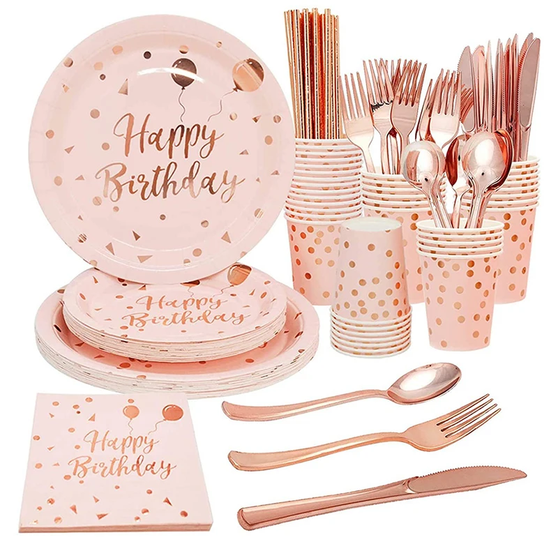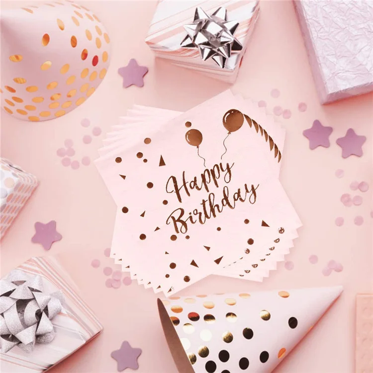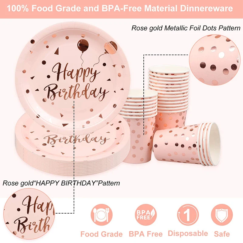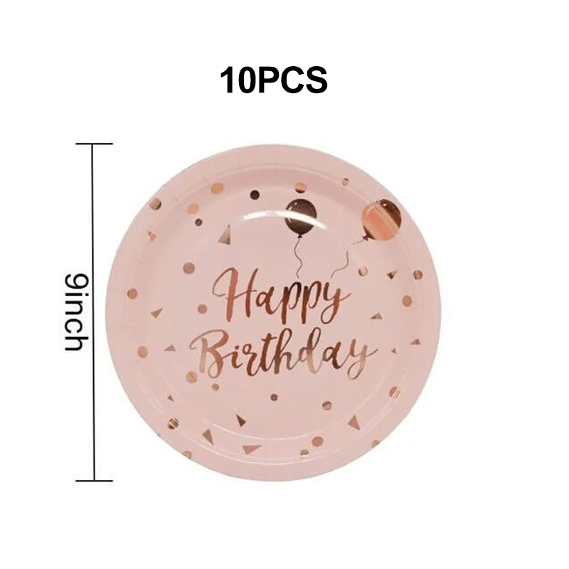 Тарелки и салфетки для дня рождения: они разработаны с розовым золотом «С Днем Рождения», воздушные шары на розовом фоне, украсят вашу посуда для вечеринки в честь Дня рождения.