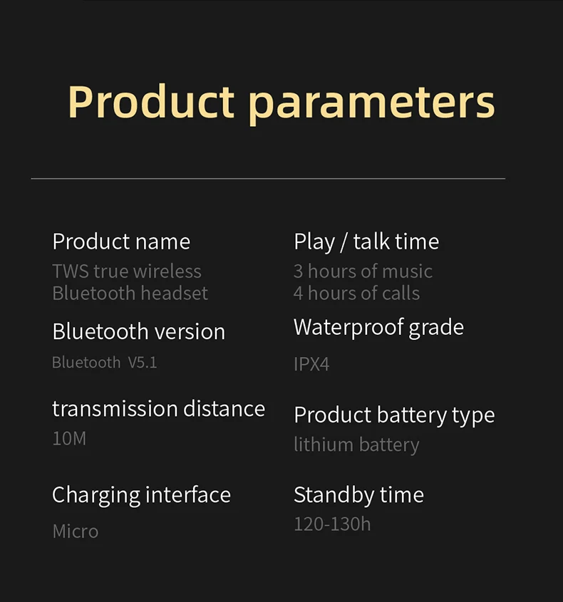 Сначала Следуйте за нашим магазином, вы можете получить дополнительную скидку 1%.Добавьте наш товар в корзину или список желаний, мы отправим Ваш заказ в приоритетном порядке после оплаты!Мы поддерживаем дропшиппинг, для получения дополнительной информации, не стесняйтесь обращаться к нам!Описание:Управление одной кнопкой легко включить/выключить, воспроизведение/пауза/Переключение музыкиЗвонки без рук для вождения, работы, встречи, бега.Одно-два подключения, можно подключить к двум мобильным телефонам одновременно.Интеллектуальная Совместимость: Поддержка всех Bluetooth мобильный телефон, планшет, ноутбук, QQ музыка, фильмы и т. Д., универсальный мобильный телефон.Характеристики:1. Версия BT: V5.02. Расстояние BT: 10 м3. Время зарядки: около 1-2 часов4. Время работы в режиме ожидания: около 80 часов5. Время работы в режиме воспроизведения музыки: около 2,5 часов6. Время разговора: около 3 часов7. Аккумулятор для наушников: полимерный литиевый аккумулятор 40 мАч8. Аккумулятор: полимерный литиевый аккумулятор 250 мАч9. Формат передачи аудио: HFP/A2DP/HSP/AVRCPПримечания:Благодаря светильник и экрана Цвет Товара может быть s светильник ly отличается из-за характеристик монитора компьютера.Возможны незначительные отклонения в размерах из-за различных измерений вручную.Посылка включает в себя:2 x наушники1 х USB кабель для зарядки1 x Руководство пользователя