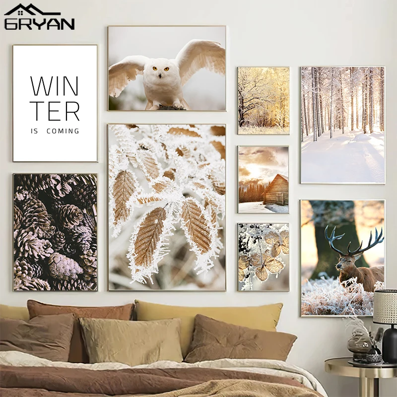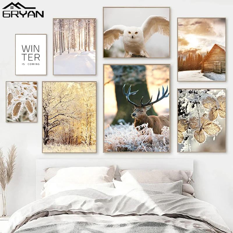 Постер с замороженными листьями в скандинавском стиле, пейзаж со снежным пейзажем, холщовая картина с изображением леса, животных, совы, оленя, домашний Настенный декор для гостиной