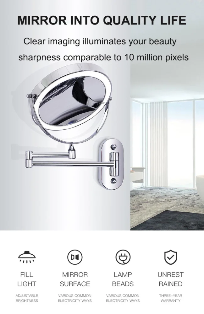 Преимущества продукта 【Материал продукта 】 С полным медным материалом и 304 материалом из нержавеющей стали, имеет техническое обслуживание, защиту от ржавчины и коррозионную стойкость. 【Мощное великолепие 】 Косметическое зеркало с подсветкой-двухстороннее круглое зеркало, 1 шт. с одной стороны, 3x или 5x или 7x или 10 шт. с другой, которое подходит для любых задач, таких как макияж, одевание, лица, бритья, твитина. 【 Вращение на 360 градусов В отличие от других трехкратных увеличительных зеркал с подсветкой, освещенное зеркало для макияжа с поворотным шарниром на 360 ° позволяет легко перемещать лицо зеркала для отличного просмотра под любым углом. 【Соответствующий светильник】 Освещенный естественным белым днем светильник светодиодный с обеих сторон, это лучший искусственный светильник для нанесения макияжа. Вам не нужно беспокоиться о том, чтобы надеть слишком много макияжа. 【 Настенный Mirror】 Легко устанавливается, его можно использовать в ванной, спальне и гардеробной и т. д. Инструкции по техническому обслуживанию 1. Регулярные чистящие средства, чтобы сохранить его яркий и чистый внешний вид; 2. С водой или нейтральным моющим средством Очистите поверхность продукта, а затем протрите мягким полотенцем; 3 обратите внимание на очистку скрытых мест продукта, своевременная очистка продуктов может иметь длительный срок.