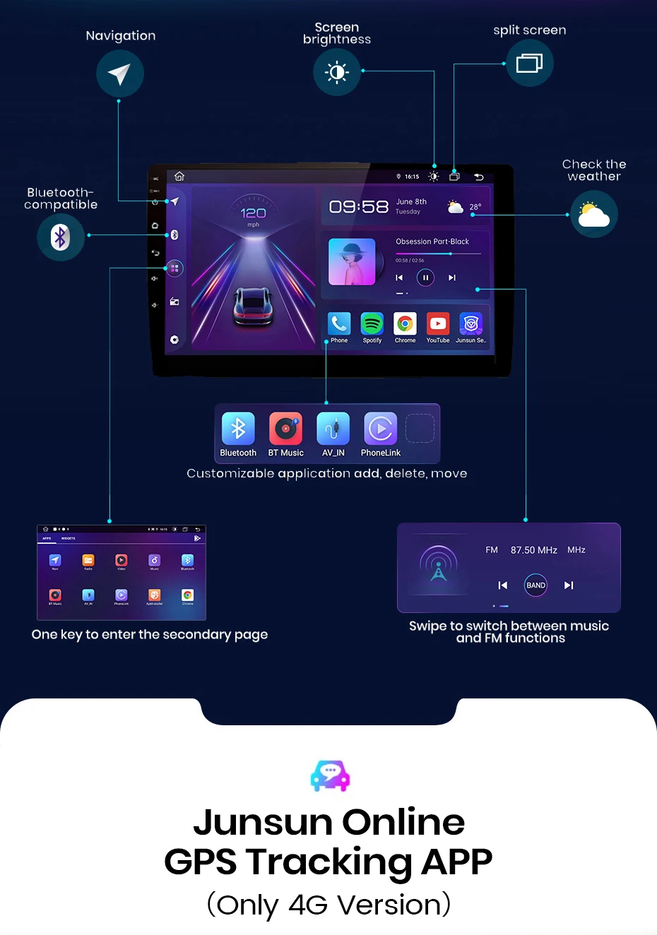 Приложение «Junsun Online», вы можете проверить информацию о отслеживании и месте парковки на своем телефоне; Более того, если вы покупаете специальный видеорегистратор, вы можете сфотографировать, что происходит рядом с вашим автомобилем; делает вашу поездку безопасной, веселой и удобной.