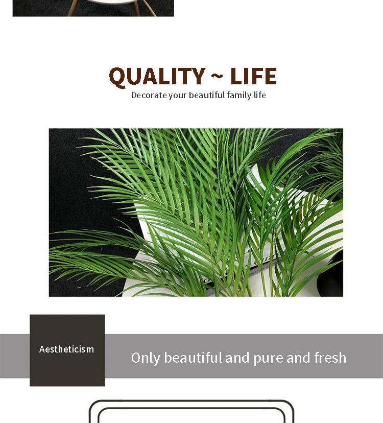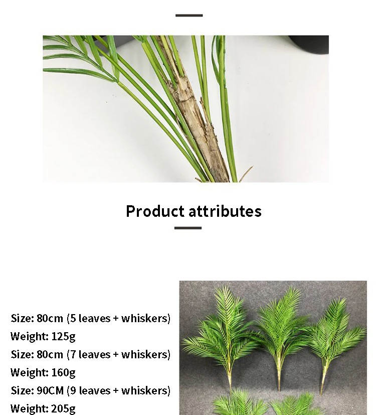 Материал: пластиковая Пальма-листСтиль: Искусственная Пальма.Цвет: Зеленые тропические ветви.Вы можете выбрать подходящий рост в соответствии с вашими предпочтениями.Размер: 80 см/90 смПосылка включает в себя: 1 шт.Серия состоит из 3 размеров.Пожалуйста, выберите правильный размер перед покупкой, чтобы избежать ненужных споров.Примечания:Из-за ручного измерения допускается отклонение в 1-2 см.Из-за различных эффектов отображения и освещения, цвет реального объекта должен зависеть от реального объектаЭто может немного отличаться от цвета, показанного на картинке. Спасибо!