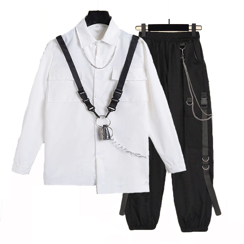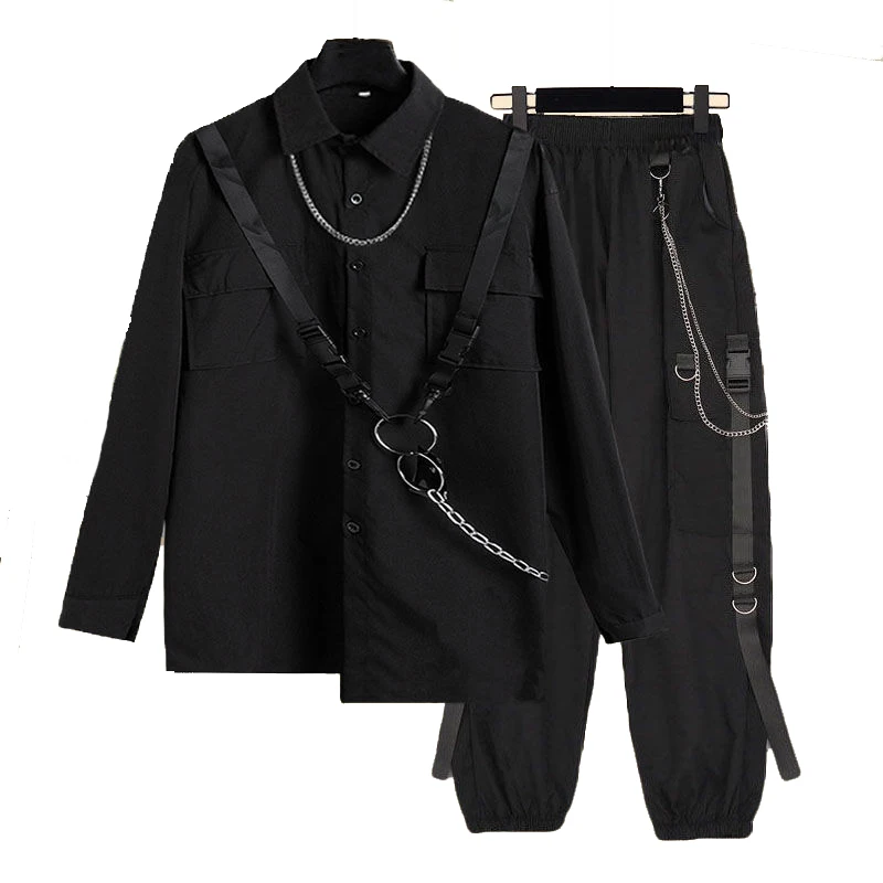 Осенне-весенний костюм унисекс из 2 предметов уличная одежда Harajuku блузка с длинными рукавами и цепочкой + брюки-карго красивый комплект из двух предметов в стиле хип-хоп