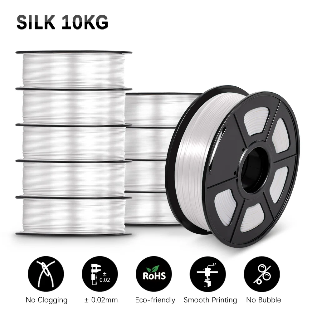 Шелк1. Экологически чистый, нетоксичный, биоразлагаемый;2. Близко к шелковому эффекту;3. Низкая усадка4. Прочность в 50 раз выше, чем PLA на рынкеПечать гладкая, поверхность готового продукта более гладкая и деликатная;Подходит для всех типов принтеров FDM3D, подходитПоделки со-печатью, художественные работы, образцы промышленного дизайнаИ модели продукции с более высокими требованиями к прочности и т. д.Диаметр: 1,75 ± 0,02 ммСкорость печати: 40-90 мм/сек.Рекомендуемая температура печати: 200-230 ℃Температура нижней пластины: 60-80 ℃