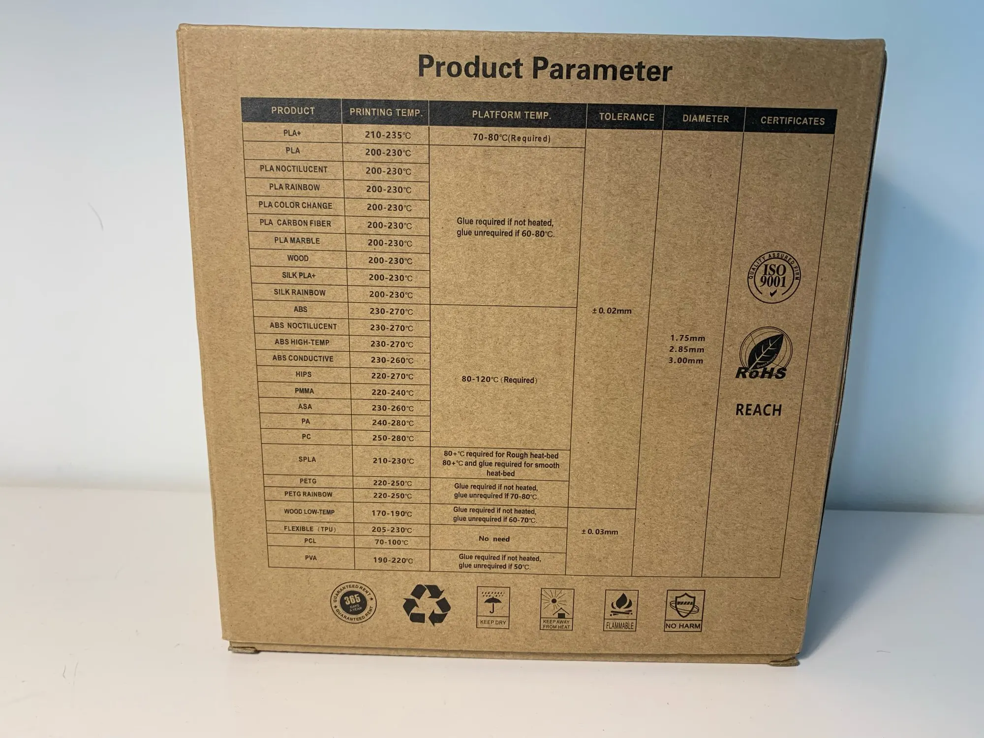 PETG1. Защита окружающей среды и нетоксичность;2. Яркий цвет;3. Низкая усадка;4. Хорошая прочность, не легко быть хрупким, хорошая кислота и щелочь сопротивление, отличноПрочность, устойчивость к погодным условиям и хорошая адгезия.5. Хорошая стабильность размеров, отсутствие трещинИ деформации.6. Высокая прозрачность и хороший блеск.Подходит для всех типов принтеров FDM3D, подходитКо-печать всех видов широко используемых моделей, ремесел, промышленностиЧасти, рекламные слова и т. Д.Диаметр: 1,75 ± 0,02 ммСкорость печати: 50-100 мм/сек.Рекомендуемая температура печати: 220-250 ℃Температура нижней пластины: 60-80 ℃Когда не нагревается: нужен клей