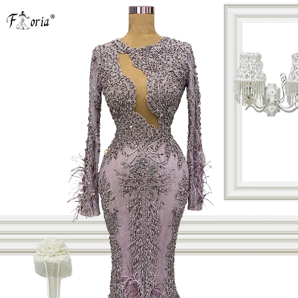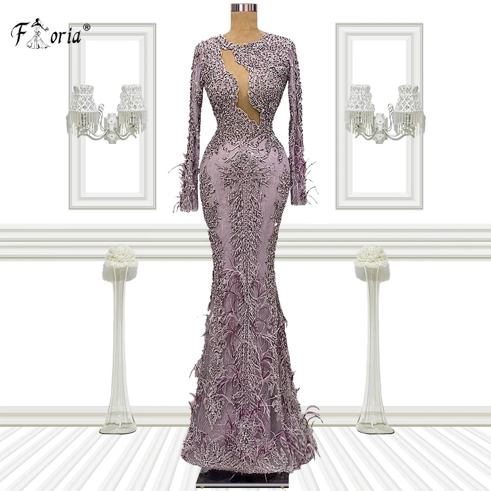 Женское вечернее платье-русалка, фиолетовое облегающее платье с длинным рукавом, бусинами и перьями, кружевное платье для вечеринки