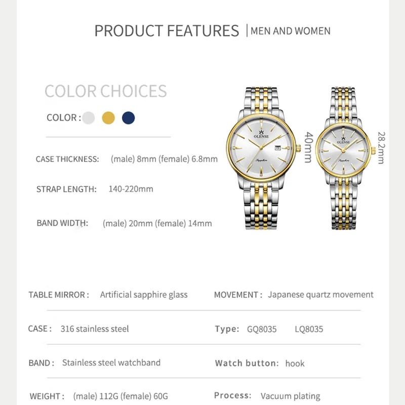 Новинка 2022, роскошные парные часы OLENSE, модные часы для влюбленных, кварцевые часы для женщин и мужчин, водонепроницаемые наручные часы, Прямая поставка