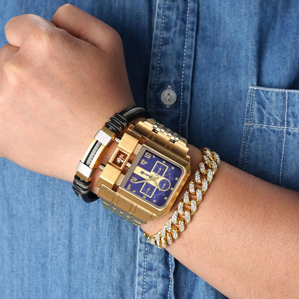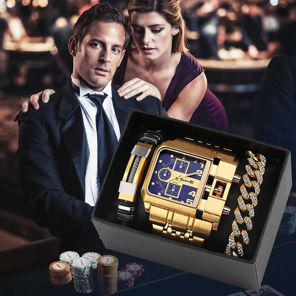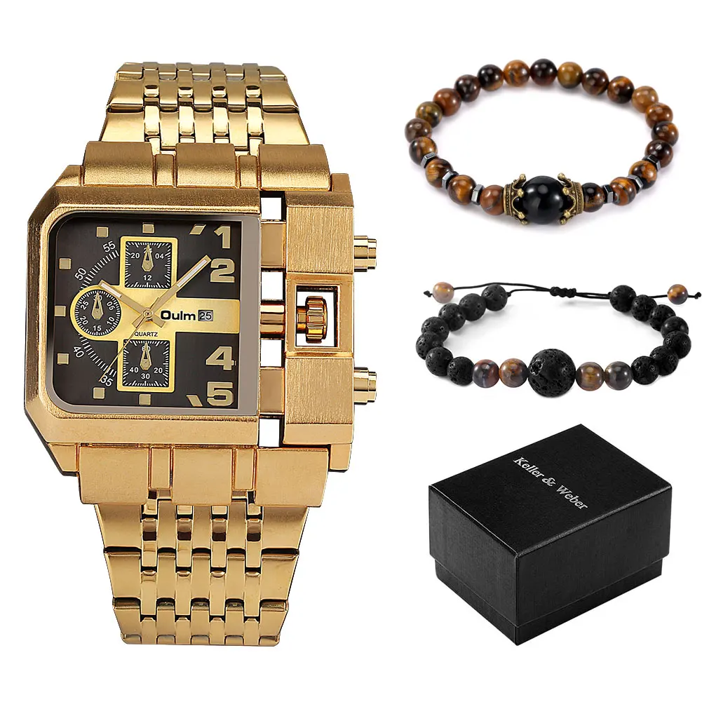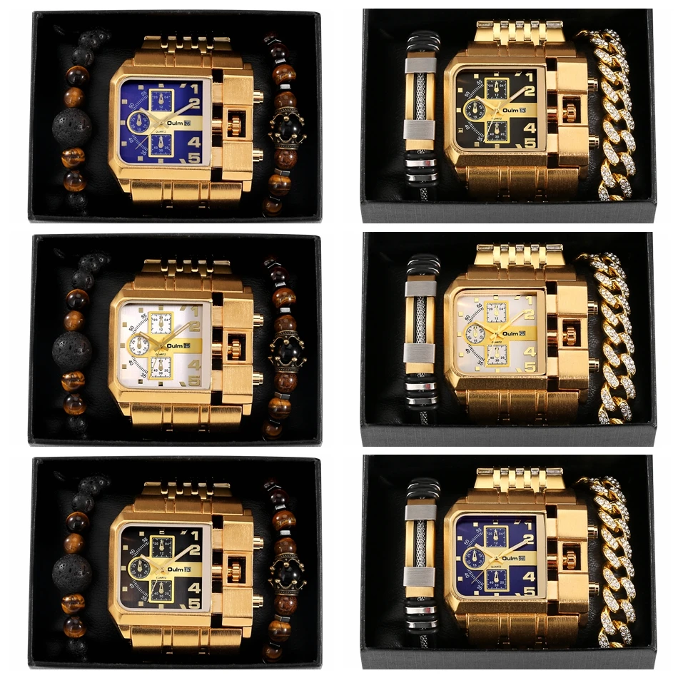 Часы Oulm Мужские регулируемые, топовые роскошные золотистые браслеты из нержавеющей стали, мужские часы с несколькими часовыми поясами, подарочный набор