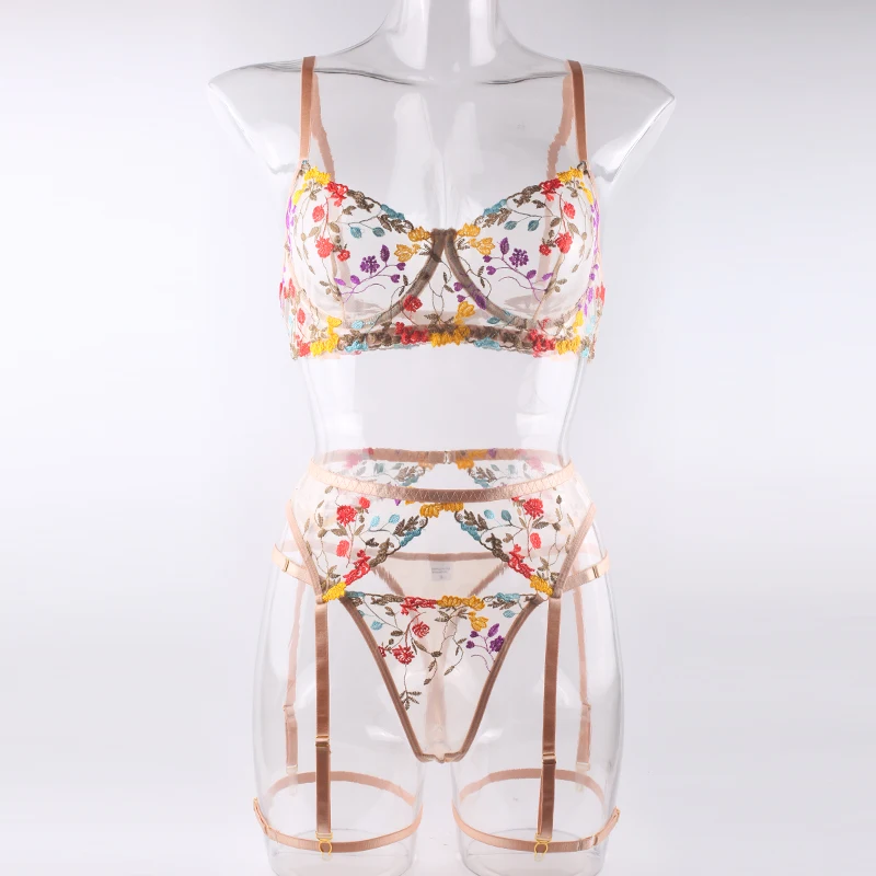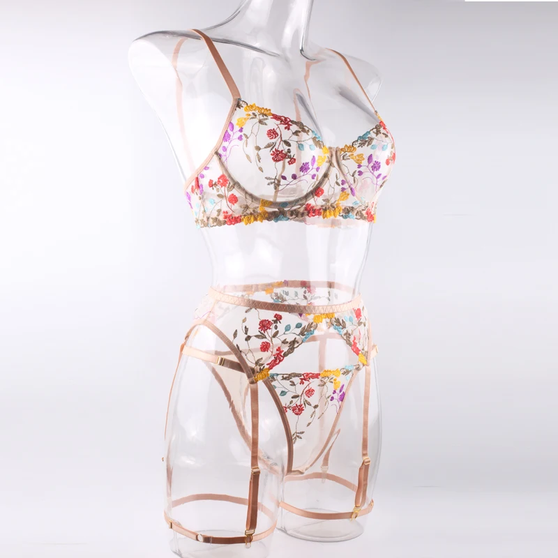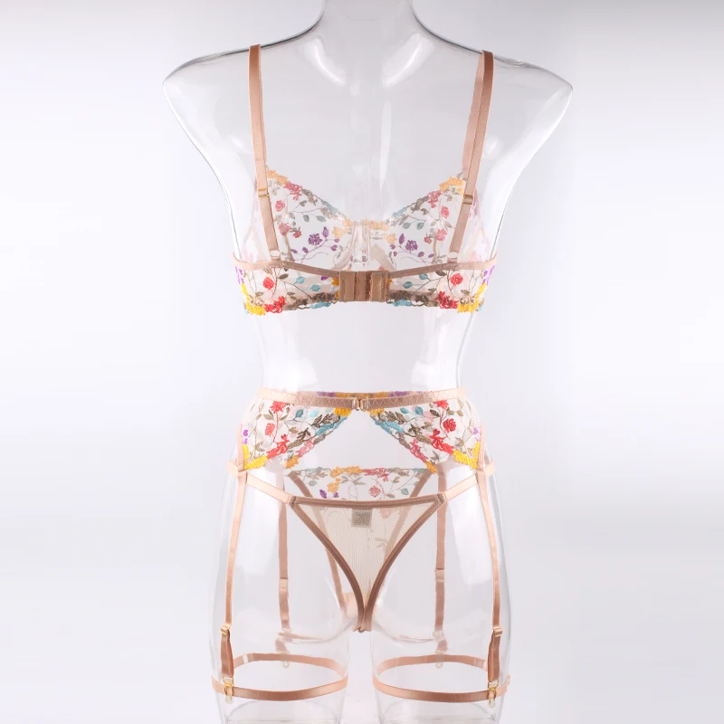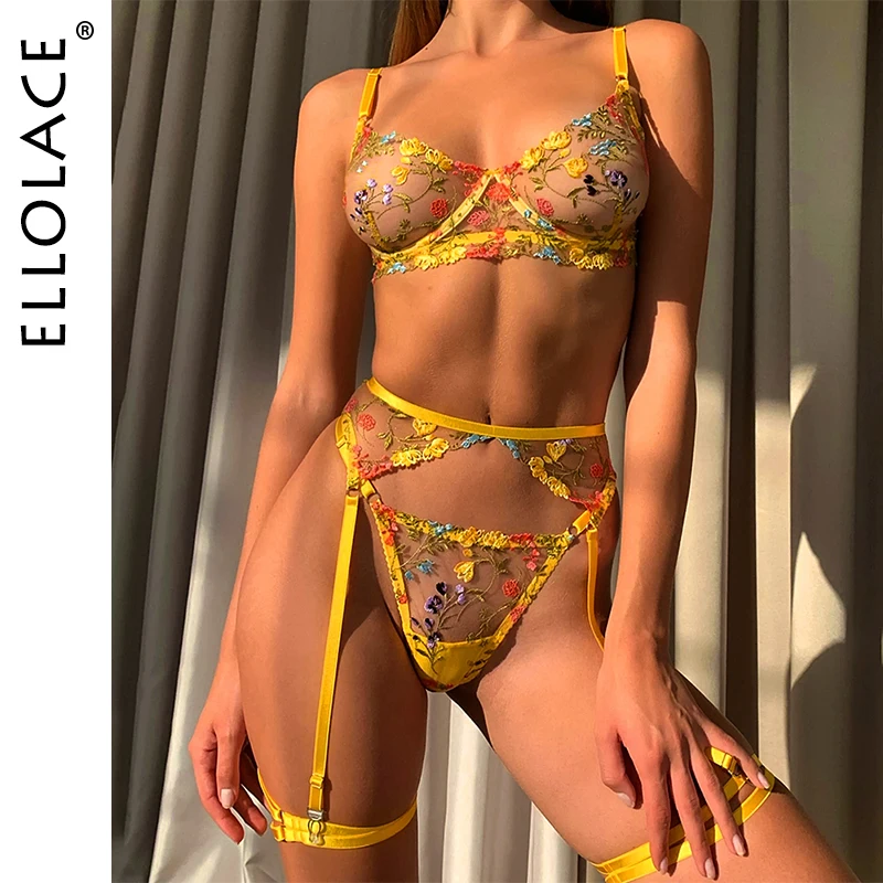 Ellolace женское белье чувственное кружевное нижнее белье прозрачная вышивка 3 предмета подвязки Необычные красивые короткие комплекты для ухода за кожей интимный
