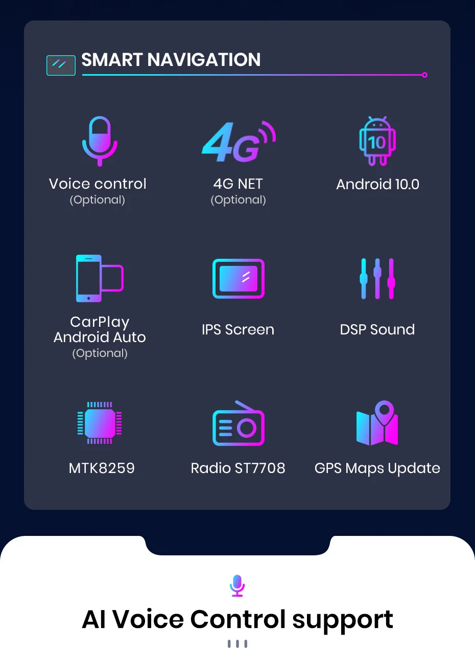 Support AI voice controlAllow you to make phone calls, navigate, play music... (Optional)