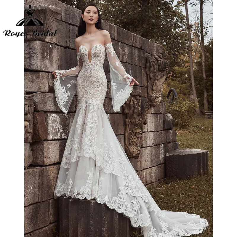 2022 очаровательное пляжное свадебное платье с юбкой-годе в стиле бохо с детализированным длинным Расклешенным рукавом Кружева аппликации с открытой спиной с глубоким V-образным вырезом и шлейфом