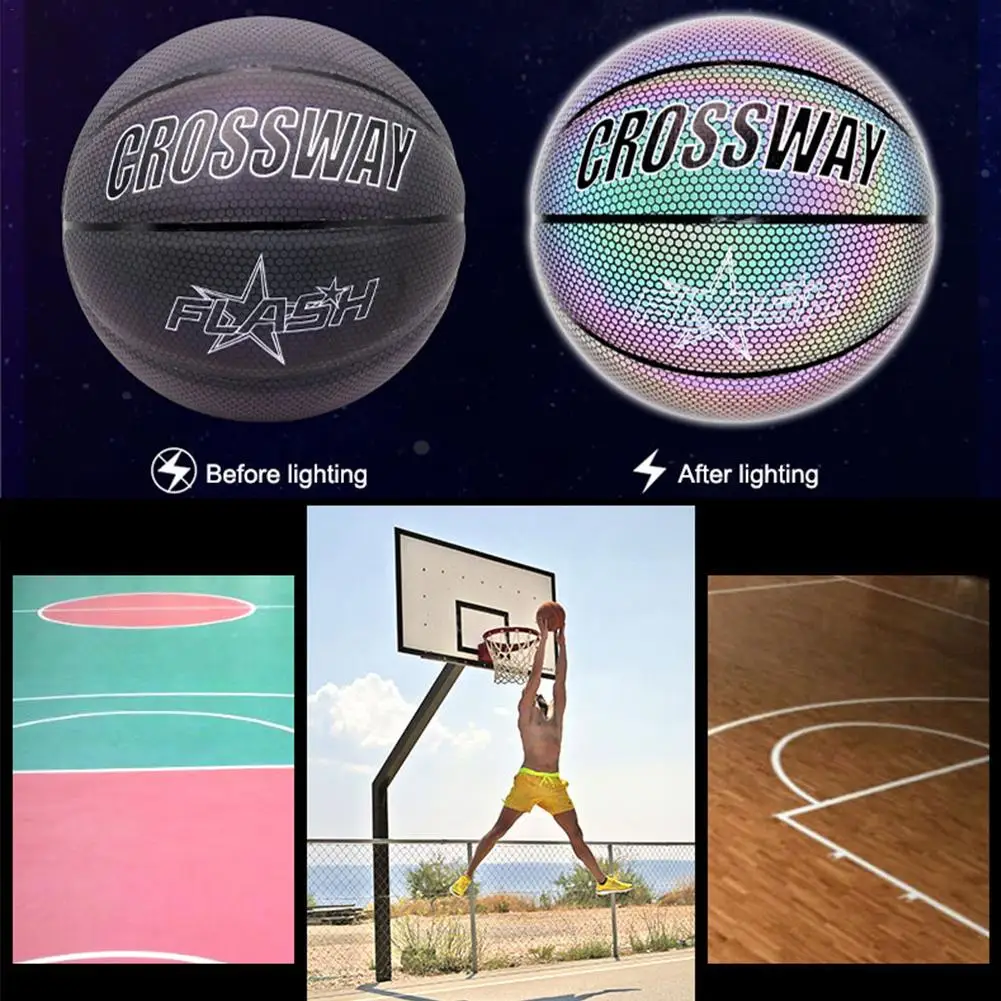 Особенности:1. Материал: Внутренний и наружный шар изготовлен из композитной гигроскопичной прочной качественной кожи со 100% нейлоновыми обмотками и резиновым пузырем для отличного удержания формы.2. Скользящая рукоятка: новый дизайн, чтобы убедиться, что наш шар оспорит вашу обработку! Все еще прекрасно отскакивает, но гладкая поверхность вызовет вас, чтобы увеличить ваши навыки обработки.3. Обучение в помещении/в ночное время: Повышение навыков, делая обработку тяжелее. Сделанный для использования в помещении, этот шар был разработан для безупречного выполнения на корте.4. Светоотражающий: мяч CROSSWAY-это Официальный баскетбольный мяч nba размера, который выглядит голографическим или светится на фотографиях или видео, когда вспышка камеры включена.5. Уникальный подарок: фотографии и видео, которые вы делаете, отлично подходят для обмена в социальных сетях, таких как Instagram, Snapchat или в любом другом месте, чтобы поделиться контентом онлайн.