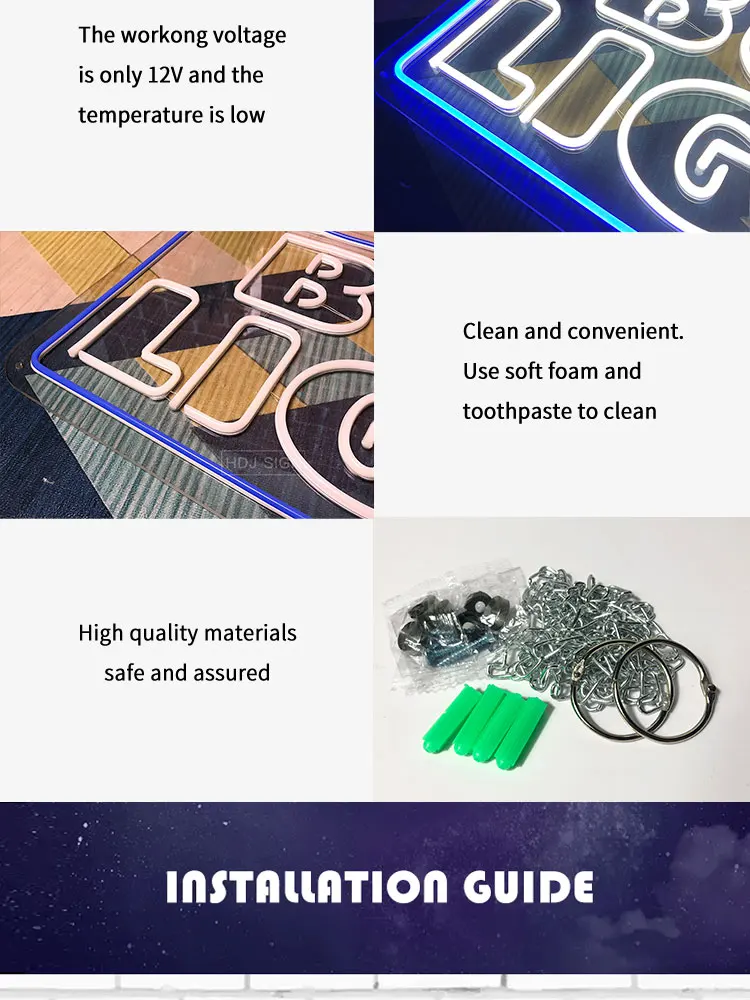 1. Акрил: обладает хорошей прочностью, светильник весом, долговечностью, не легко повредить, прозрачные материалы делают неоновый светильник s более красивым