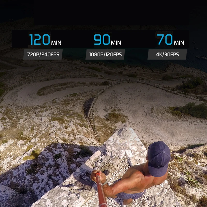 Срок службы батареи в различных режимах:720P/240FPS около 120 минут;1080P/120 кадров в секунду около 90 минут;4K/30fps около 70 минут;