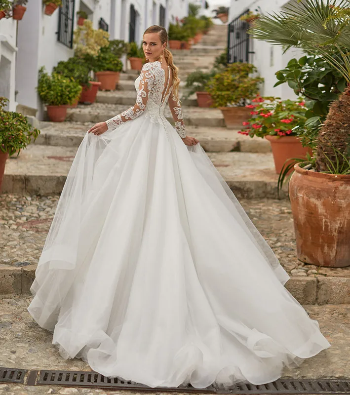 Свадебные платья с длинным рукавом и V-образным вырезом, 2022, фатиновое платье с аппликацией для невесты, элегантное кружевное свадебное платье со шлейфом