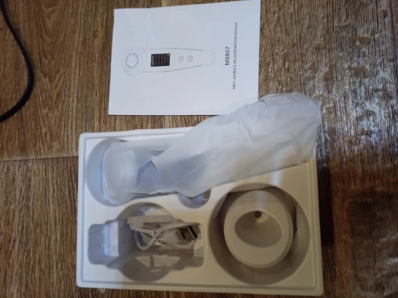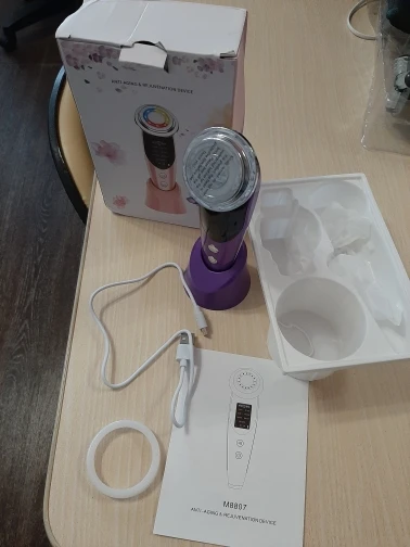 пришёл разряжен,зарядила и проверила его работу всё функции, но не использовала ещё. Коробка помята,для подарка не подойдёт, всё в полной комплектации,шнур для зарядки,кольцо для важного диска очистки кожи, инструкция на английском .У меня есть инструкция на русском, я просто покупала в подарок данный прибор у другого продавца. Легко в использовании, нижняя кнопка включения, включения и смена функций, верхняя кнопка меняет мощность их 3.Использовать нужно на влажное лицо сыворотка или тканевая маска.Чтобы увидеть результат нужно использовать более 2х месяцев з раза в неделю. Чаще тоже не нужно. Каждая функция длится от 4-7 мин. и отключается.Зарядка 3часа,хватает на 10 использовании примерно, может больше. Советую!