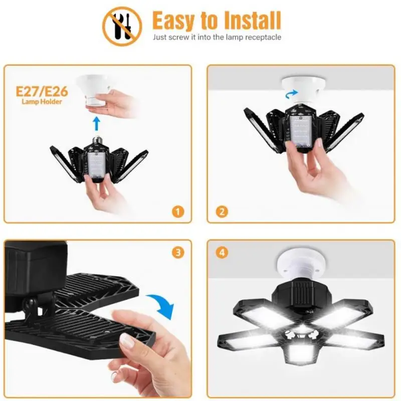 Простота установки и использования. Никаких инструментов или проводов не требуется, просто прикрутите потолочный светильник гаража в стандартном основании E26/E27. Это отличная замена обычных люминесцентных светильников для гаража, склада, подвала, мастерской и большинства рабочих мест.